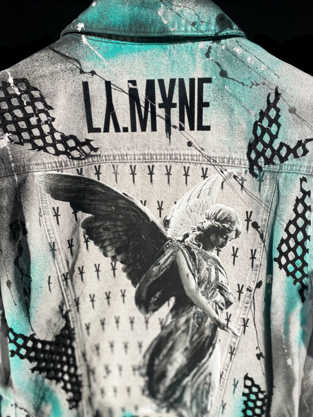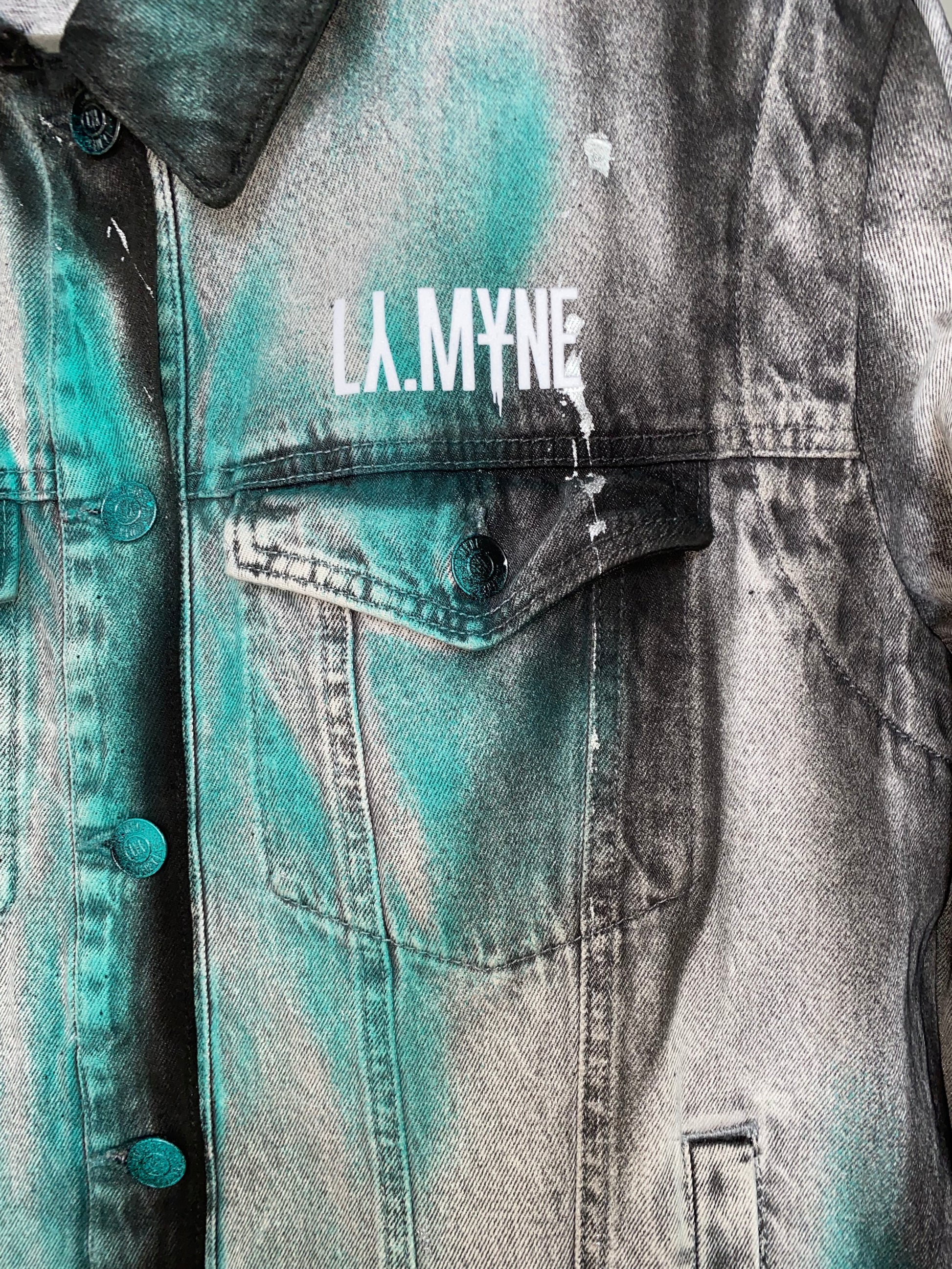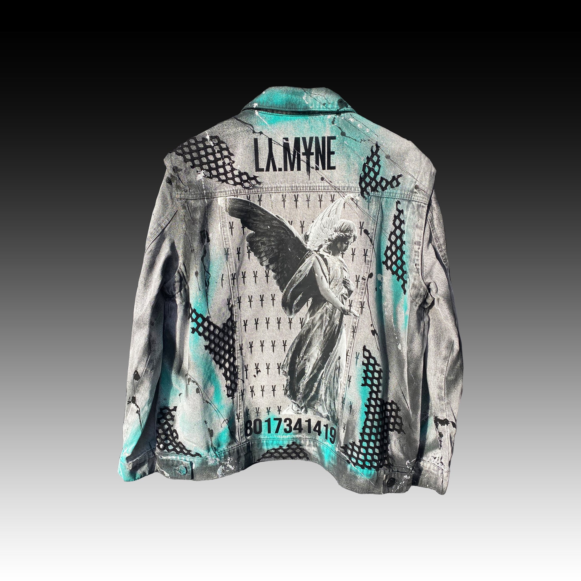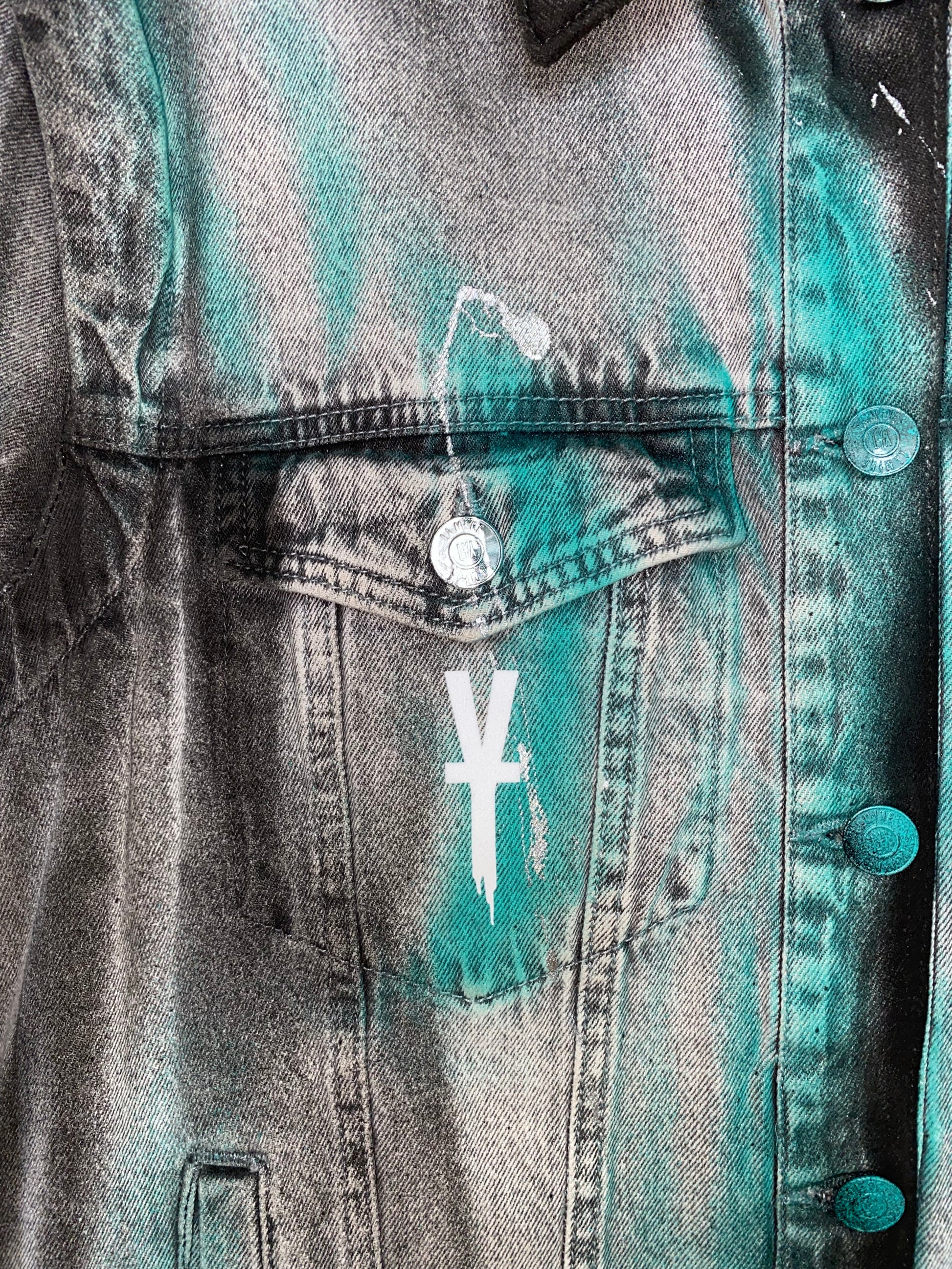 Además del metal plateado, varios parches y aplicaciones decoran esta hermosa chaqueta vaquera gris. El color turquesa completa el diseño por completo. No importa si quieres ir a un festival o ser el centro de atención en la vida cotidiana. Con esta pieza única atraerás todas las miradas.