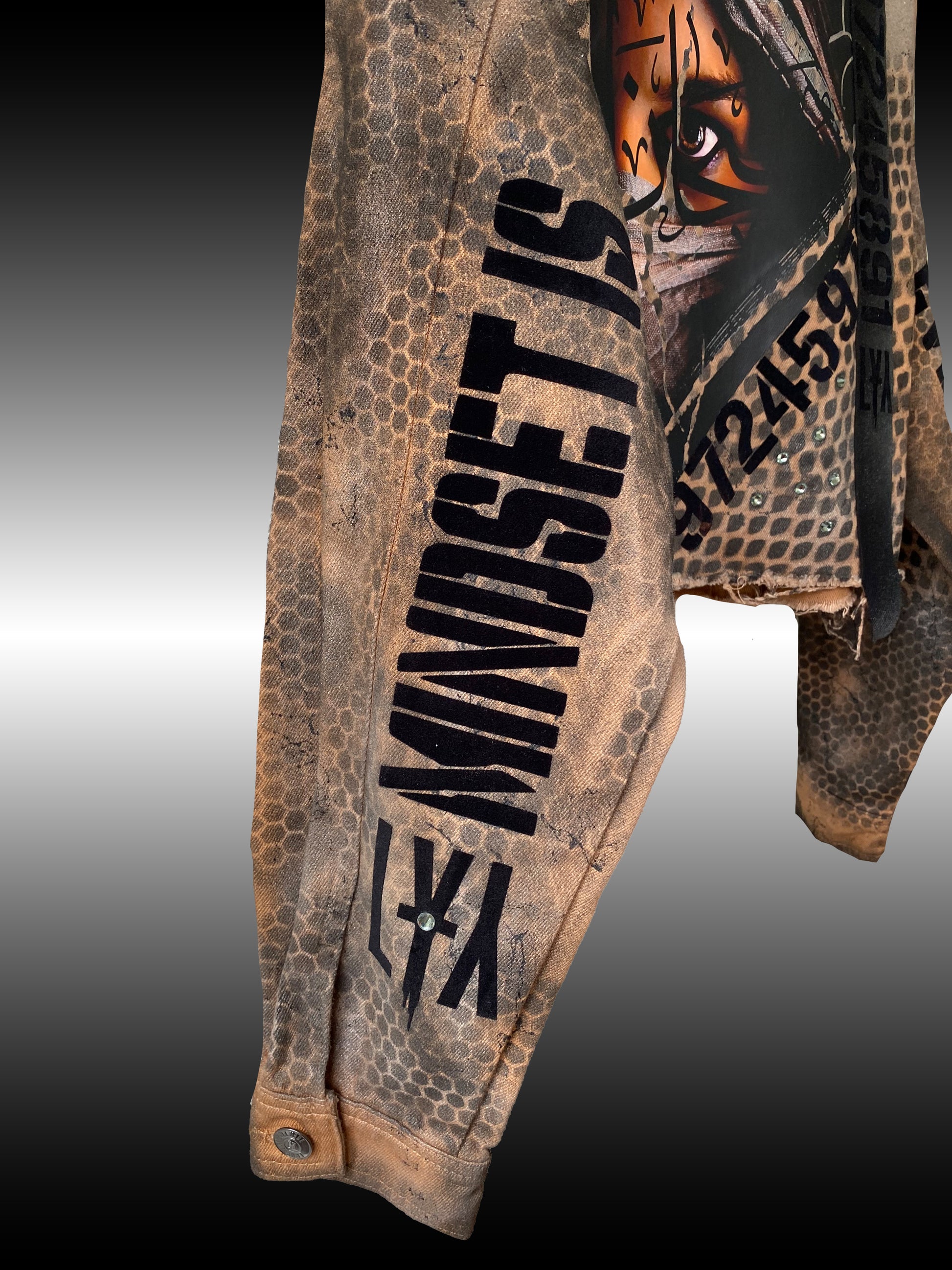 Esta chaqueta vaquera corta de color marrón presenta un estampado moderno y varios detalles. Además de las letras, la chaqueta también está adornada con toques de color y pedrería. El diseño fue realizado a mano y es completamente único.