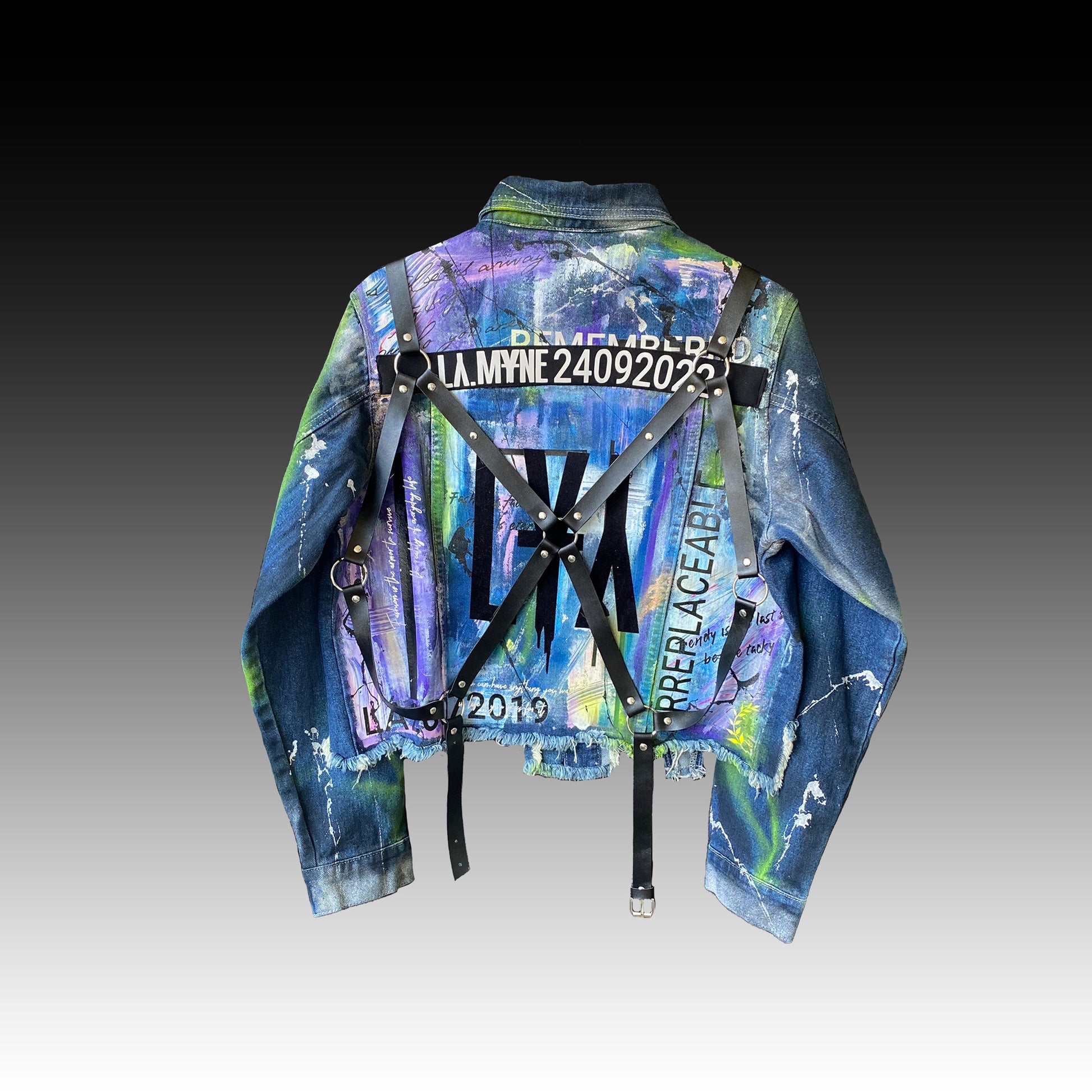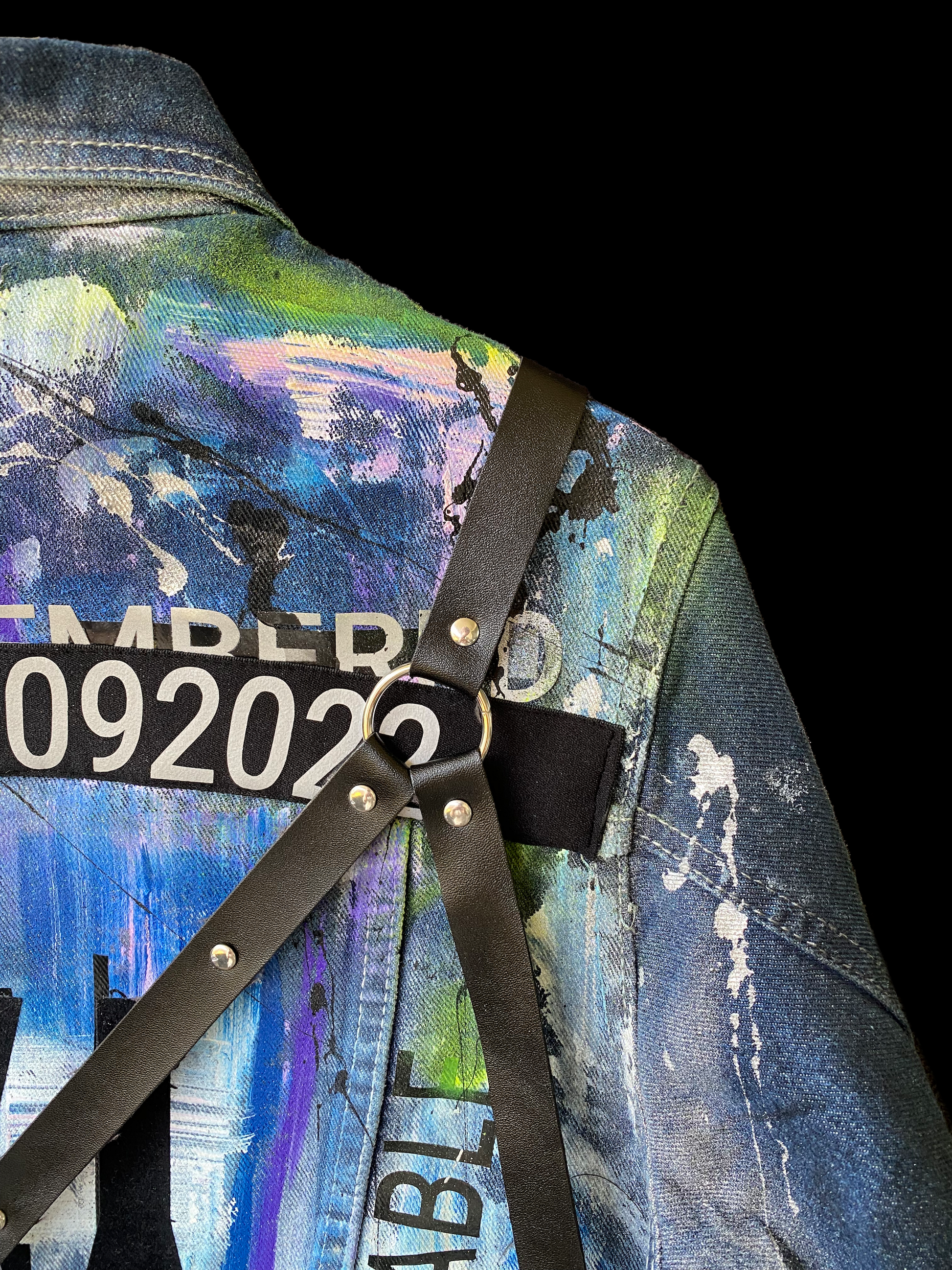 Nuestra chaqueta vaquera "Bondage Girl" es una pieza única muy especial. Como una obra de arte, cuanto más miras la chaqueta, descubres más y más detalles.