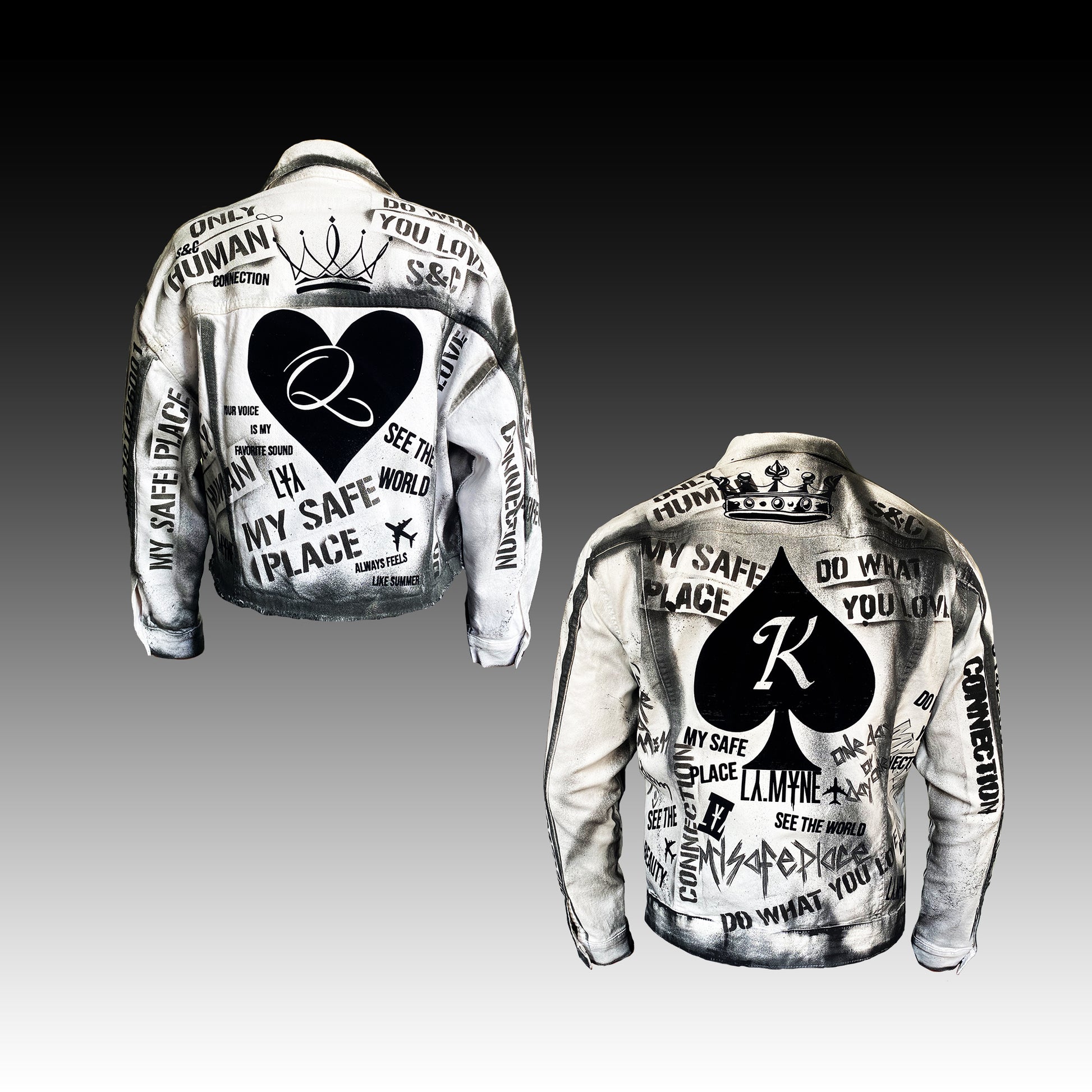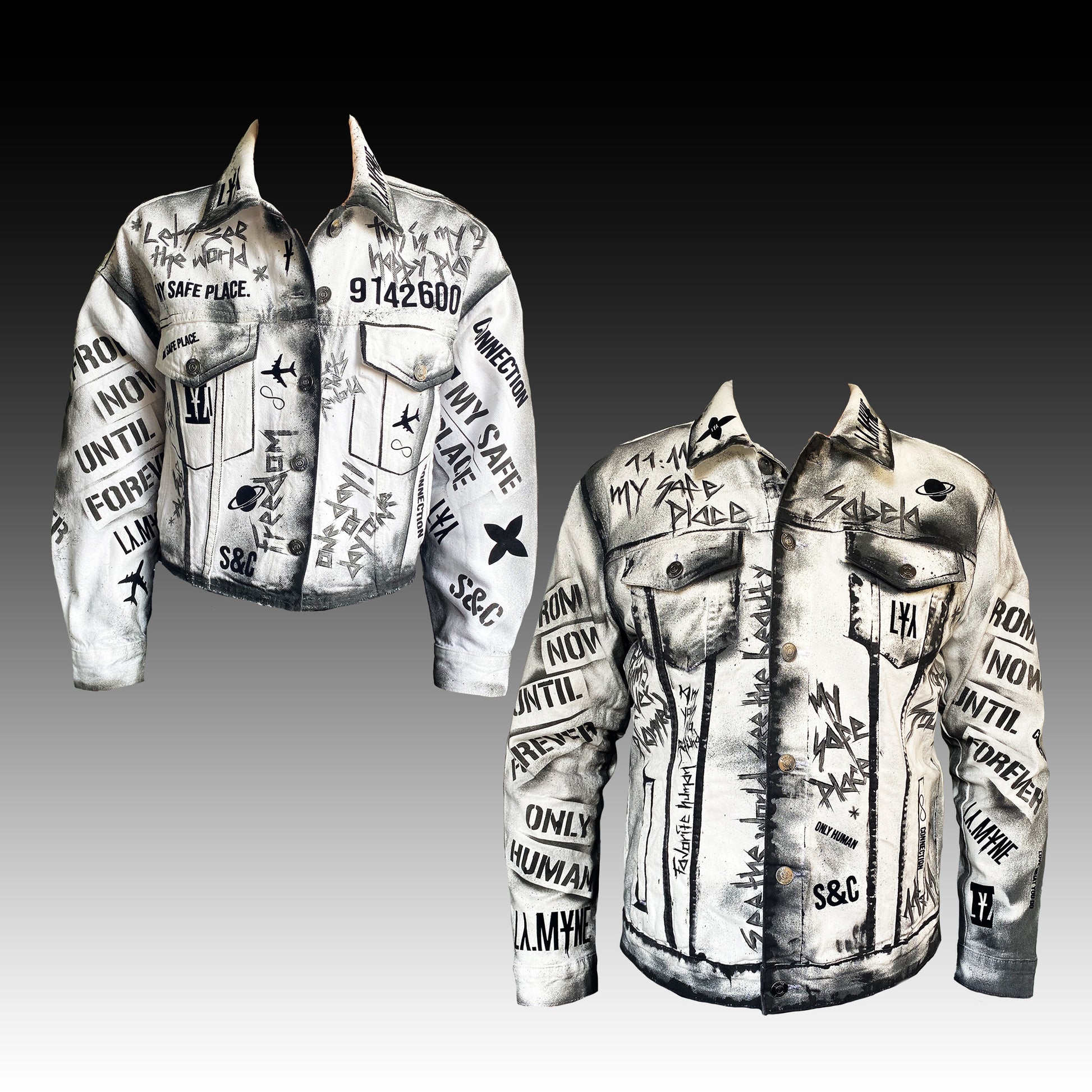 En estas fotos de producto puedes ver dos productos de ejemplo. Las chaquetas vaqueras blancas se refinaron con símbolos y letras personales. Podemos crear la Edición para Parejas para ti según tus deseos. Ordene las chaquetas en línea y escríbanos sus deseos especiales para las dos chaquetas como nota al comprar o por correo electrónico a info@lamyne.com.