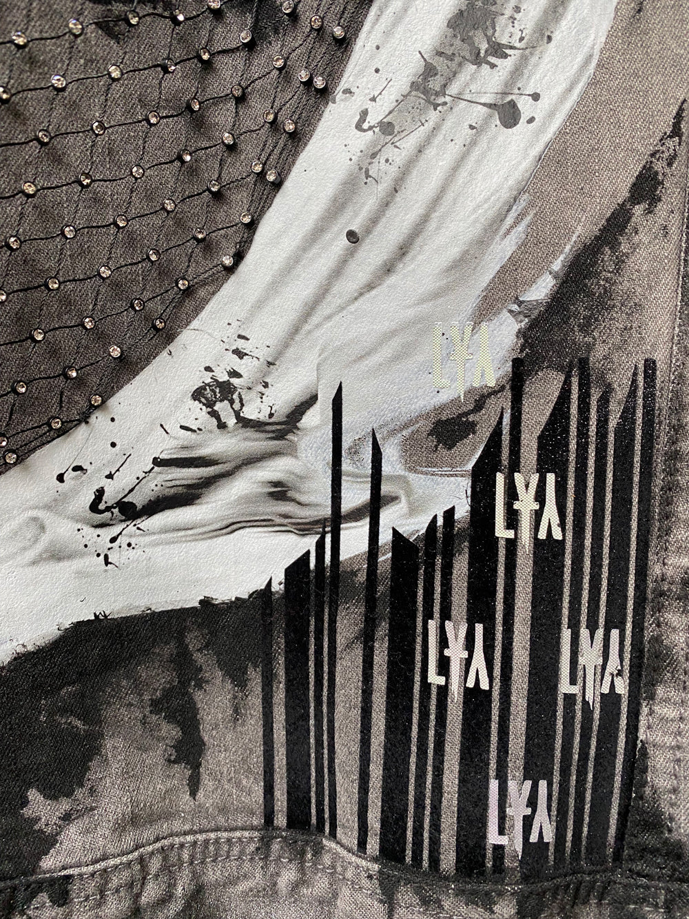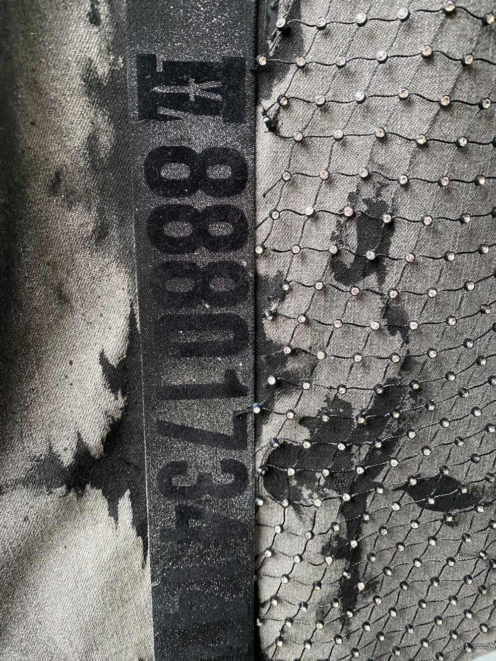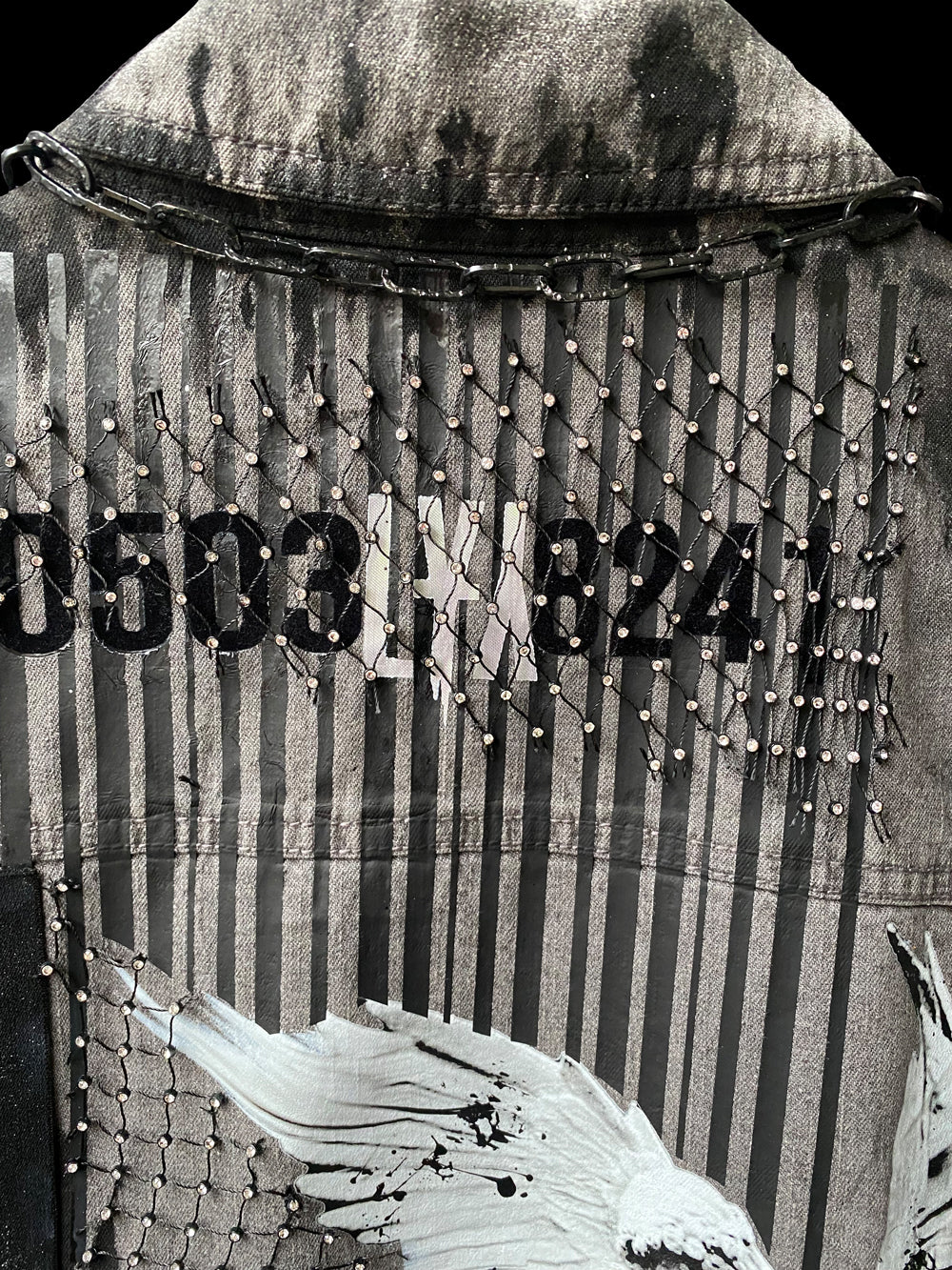 Esta prenda especial fue diseñada con muchos detalles elaborados. Todo fue instalado a mano con gran atención al detalle. Además de los detalles rústicos de las cadenas, la rejilla con pedrería añade un toque elegante.