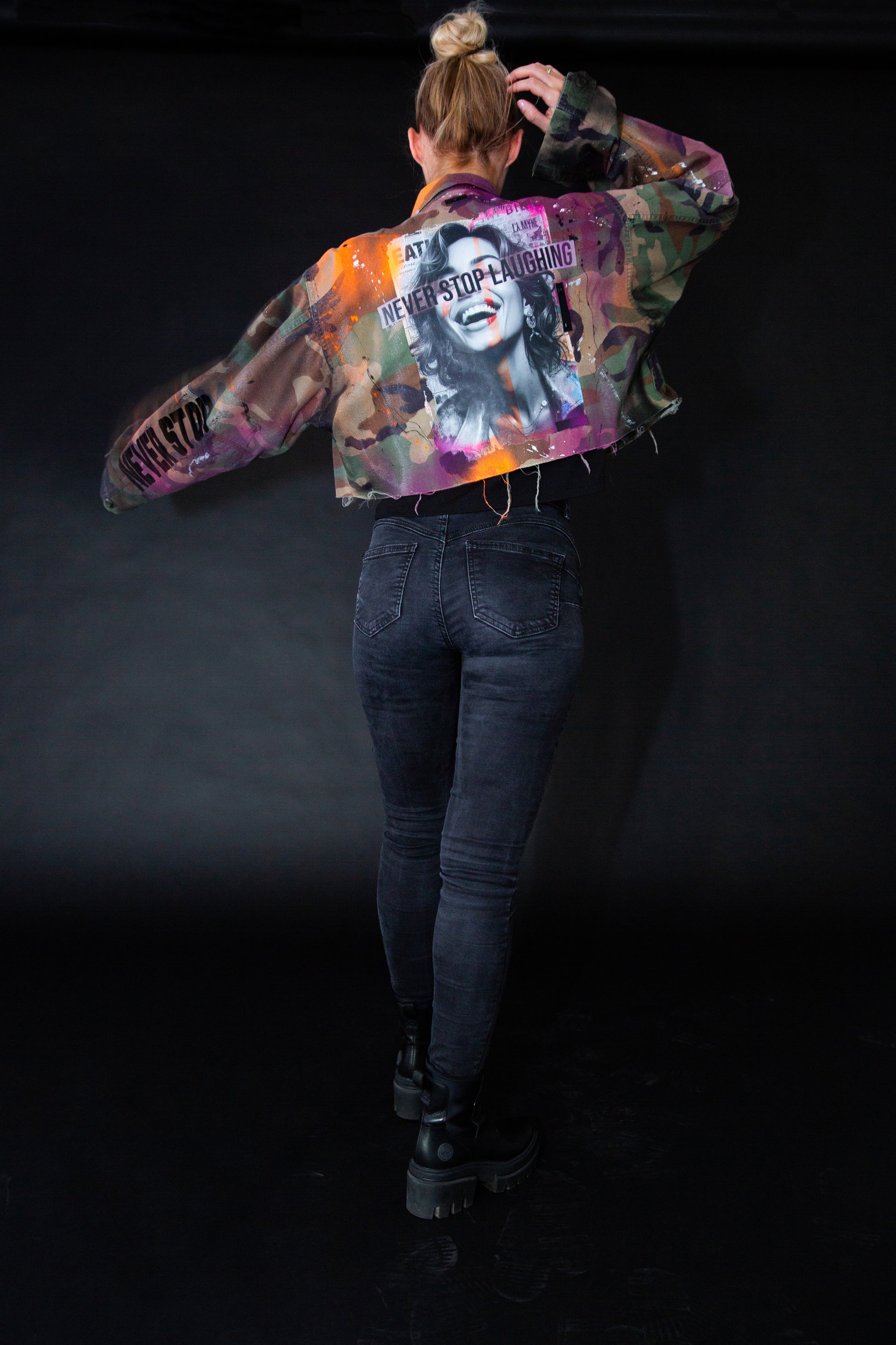 La chaqueta militar corta tiene un estampado moderno y varios detalles. Además de las letras, la chaqueta también está adornada con toques de color, parches de cuero y remaches. El diseño fue realizado a mano y es completamente único.