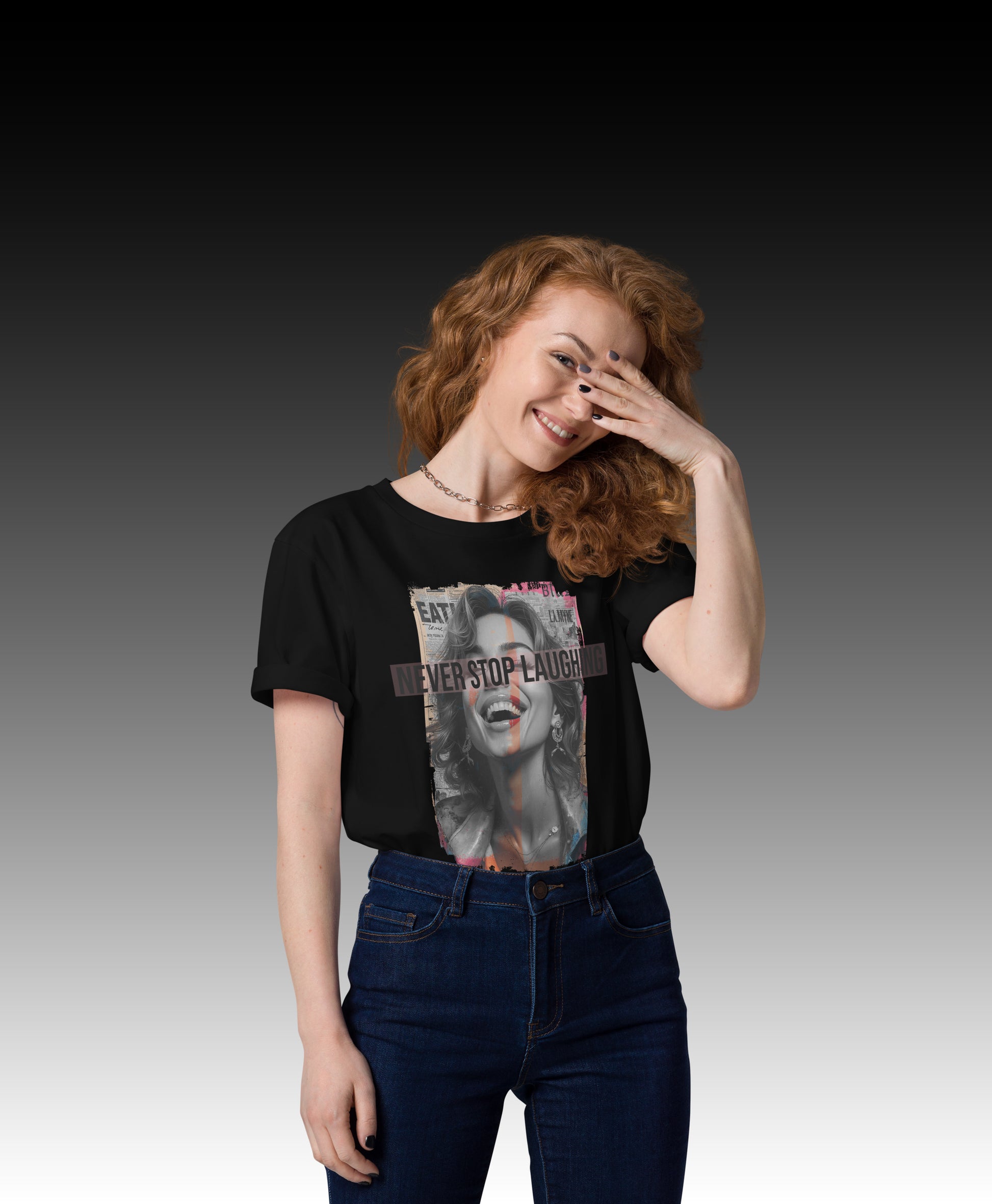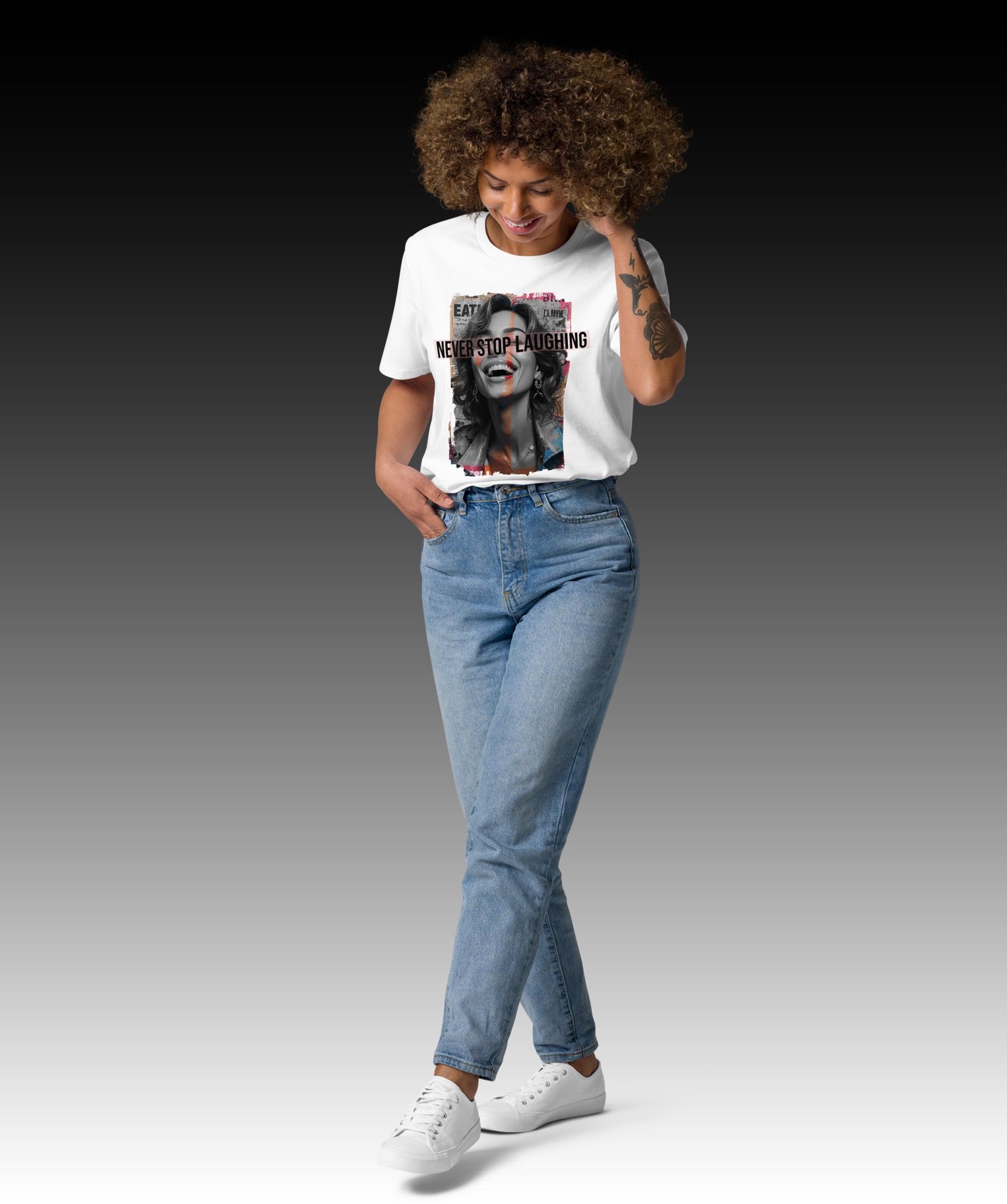 Confeccionada 100 % con algodón orgánico hilado en anillos, esta camiseta para mujer es imprescindible. Es de alta calidad, súper cómodo y, lo mejor de todo, respetuoso con el medio ambiente. ¡Con el diseño "Never Stop Laughing" definitivamente llamarás la atención!