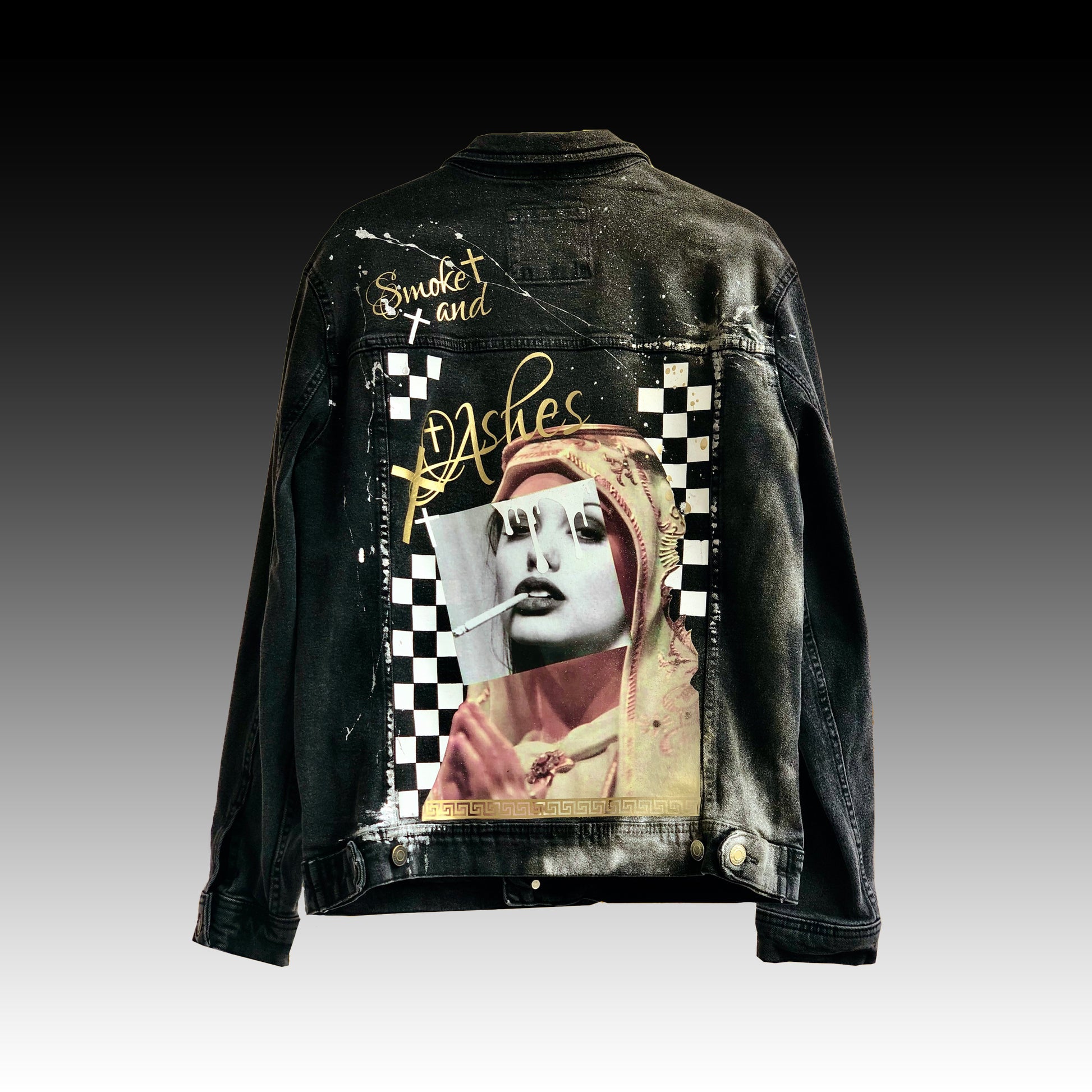 Esta chaqueta vaquera negra tiene el diseño "Smoke and Ashes". Los cuadros y los detalles dorados hacen que la chaqueta llame la atención.