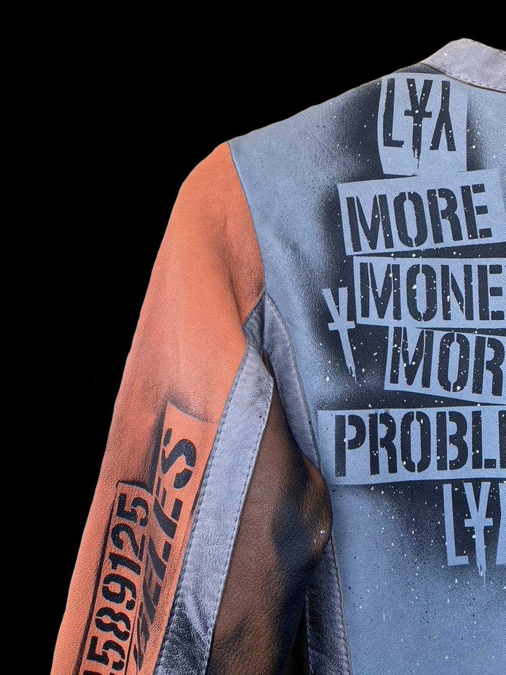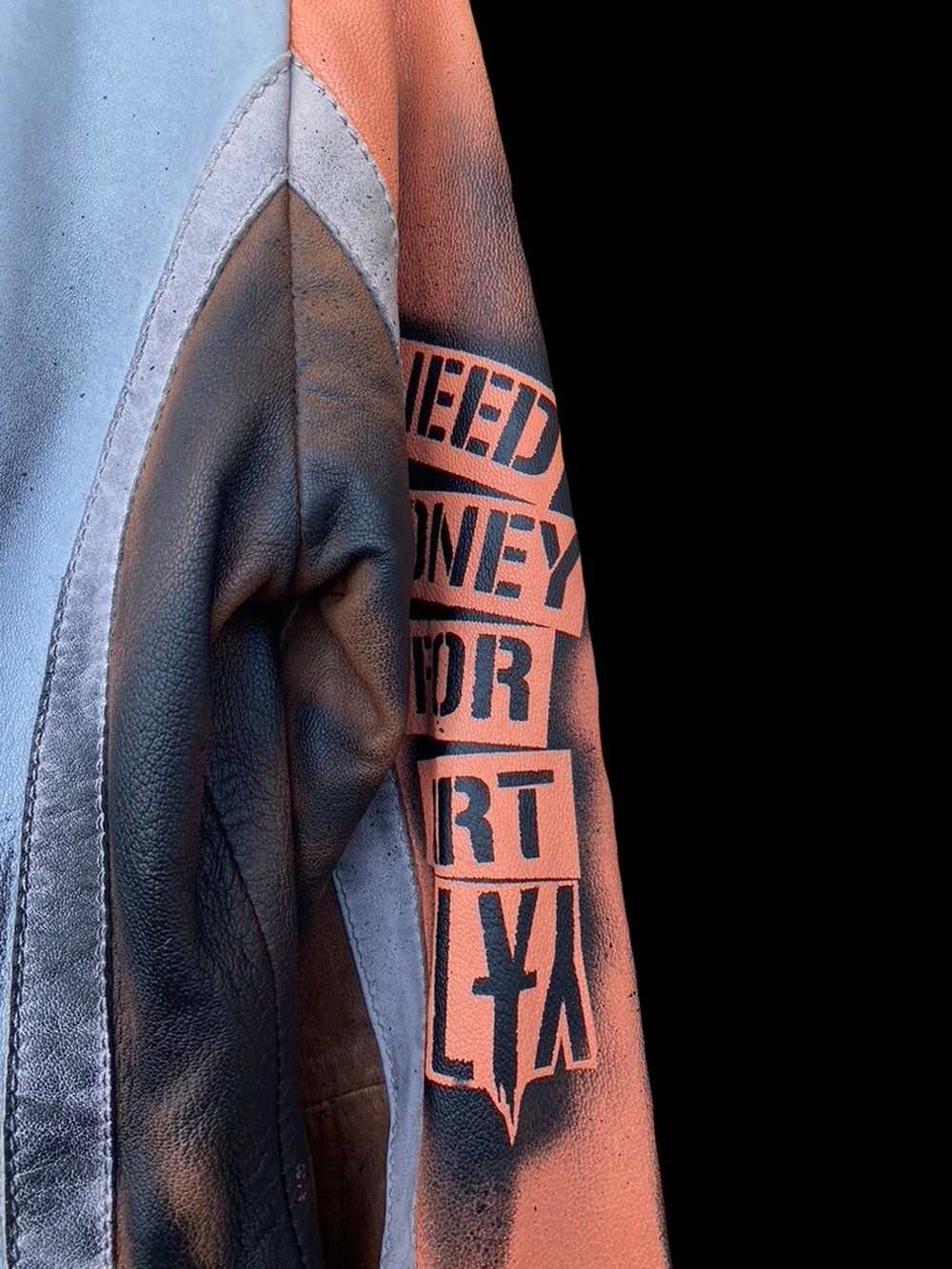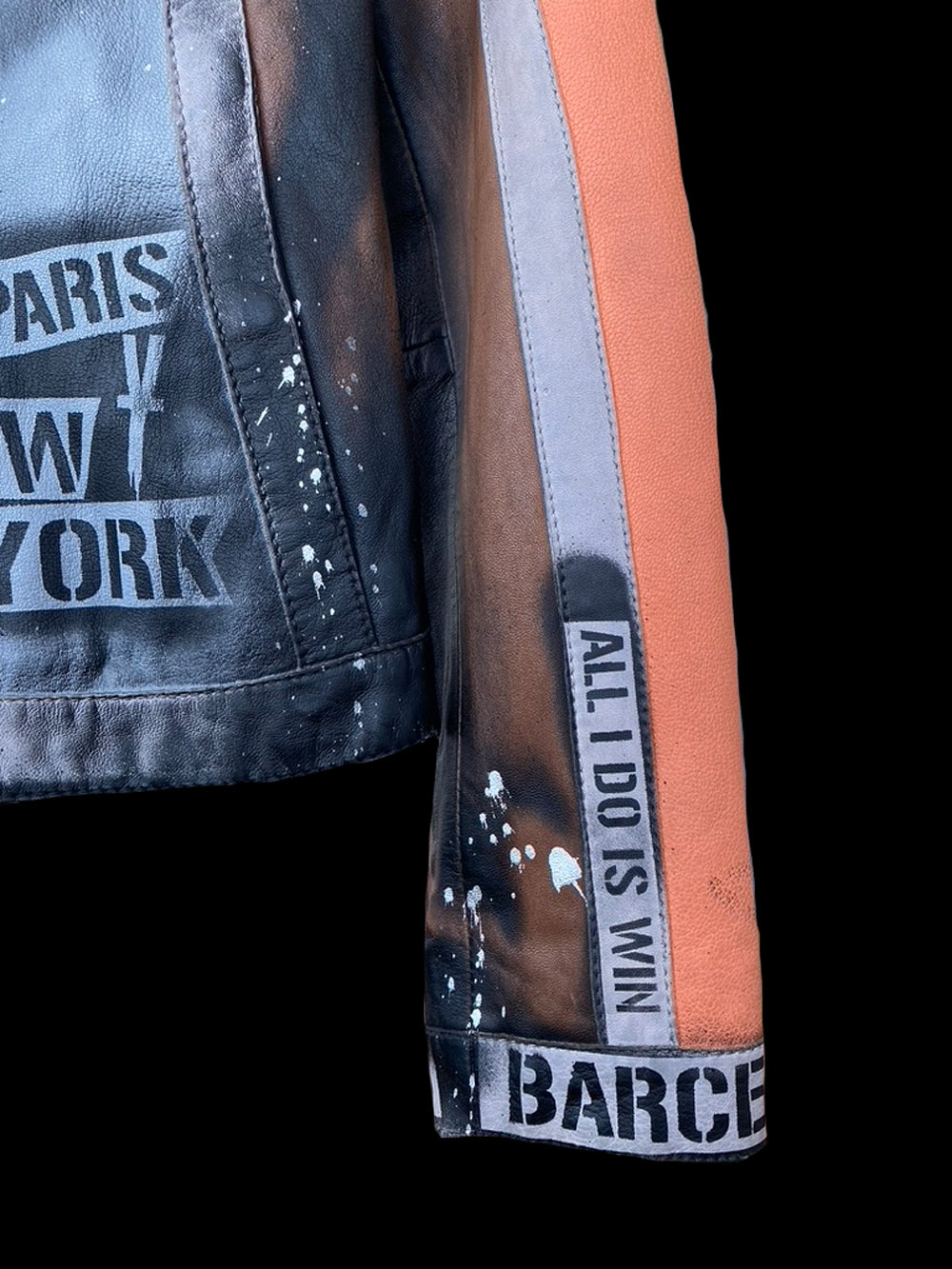 Esta chaqueta de cuero con bloques de color ha sido decorada con declaraciones geniales. ¡Con esta pieza única, definitivamente llamarás la atención!