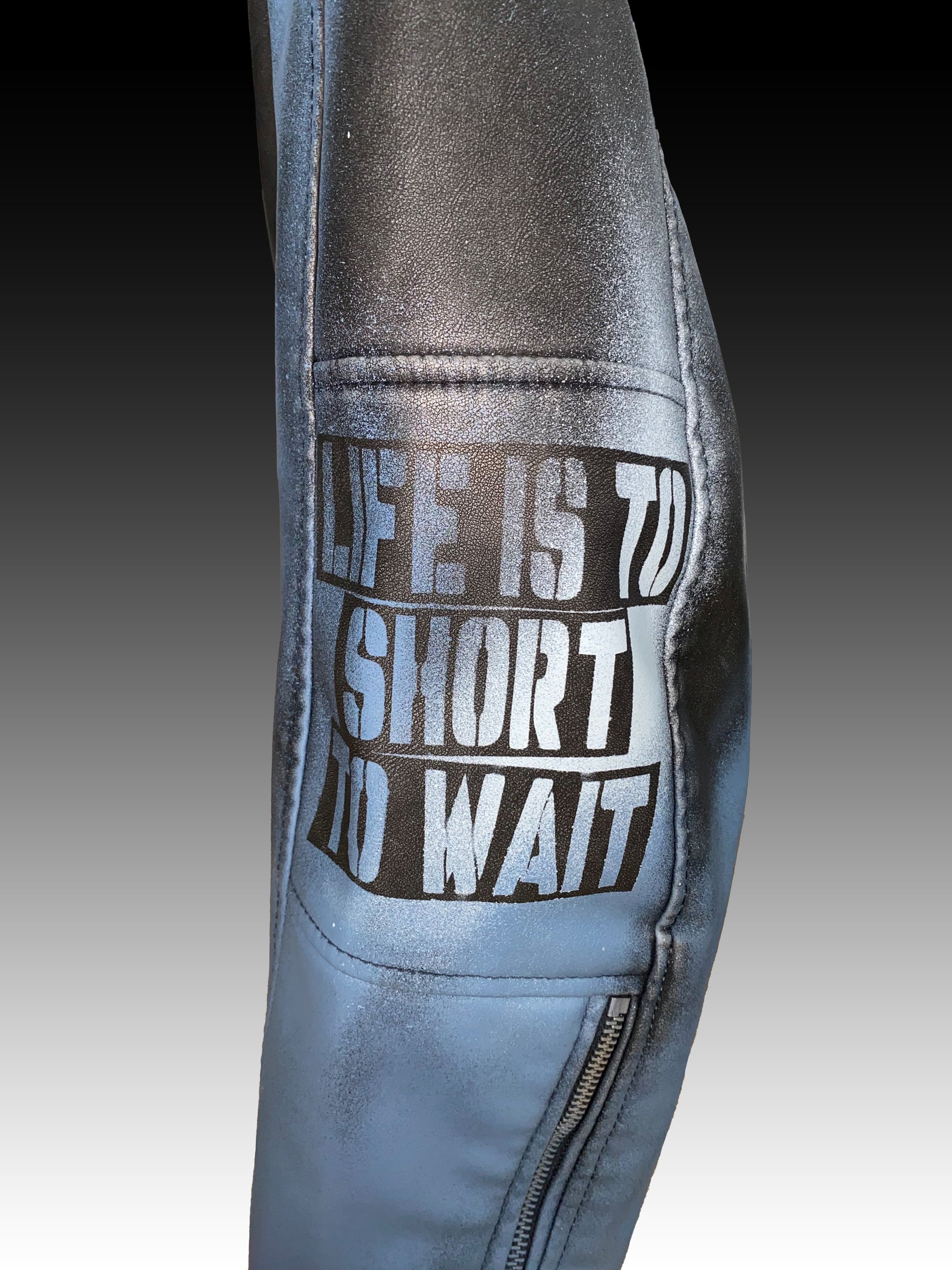 Diese oversized und kurz geschnittene Lederjacke ist dank des handgefertigten Designs ein richtiger Hingucker. Die Vorderseite der Jacke ist mit einem auffälligen Statement Design versehen, wobei die Rückseite der Jacke eher schlicht geblieben ist. Der blaue Farbverlauf ist perfekt für den Frühling.