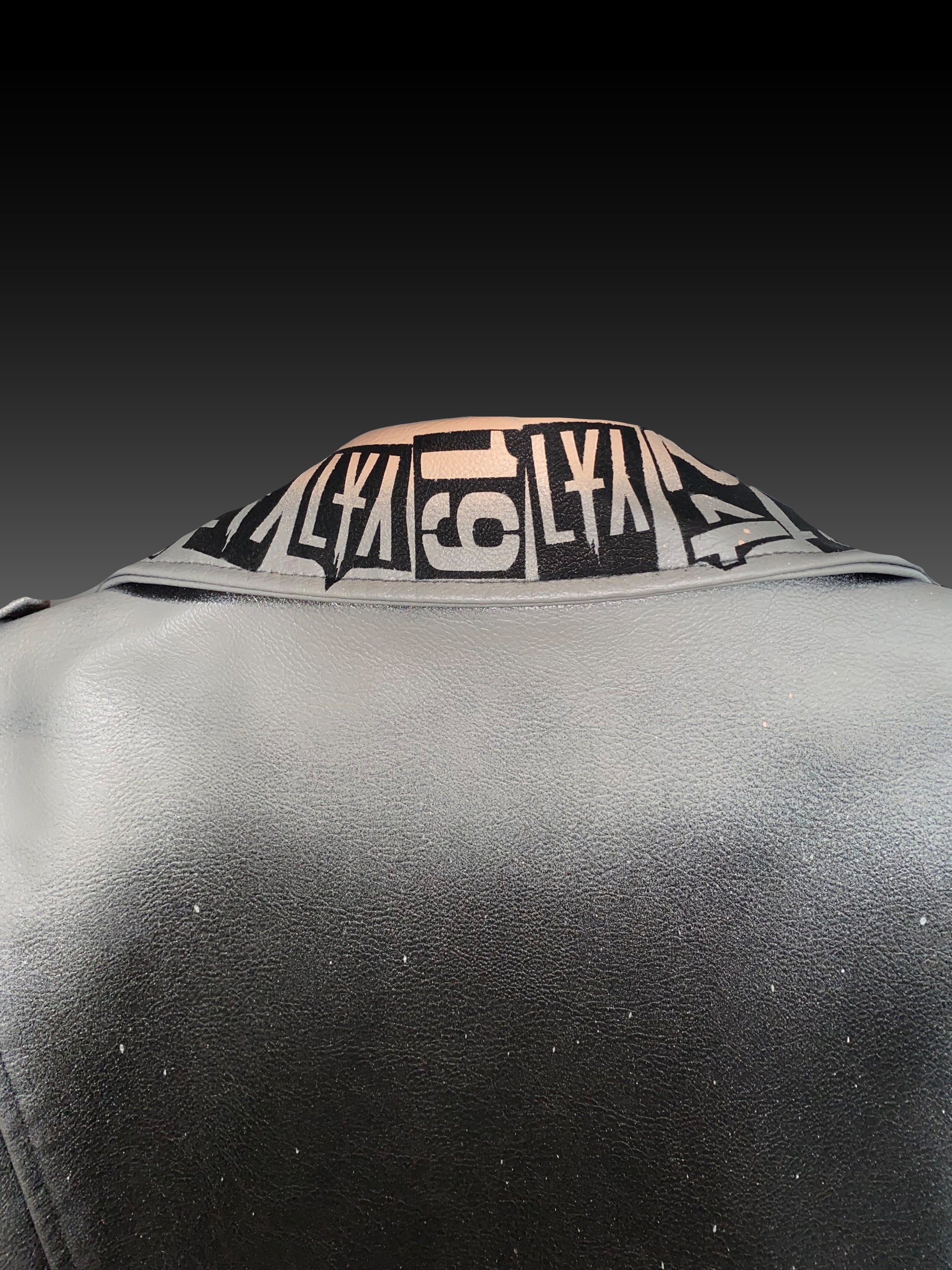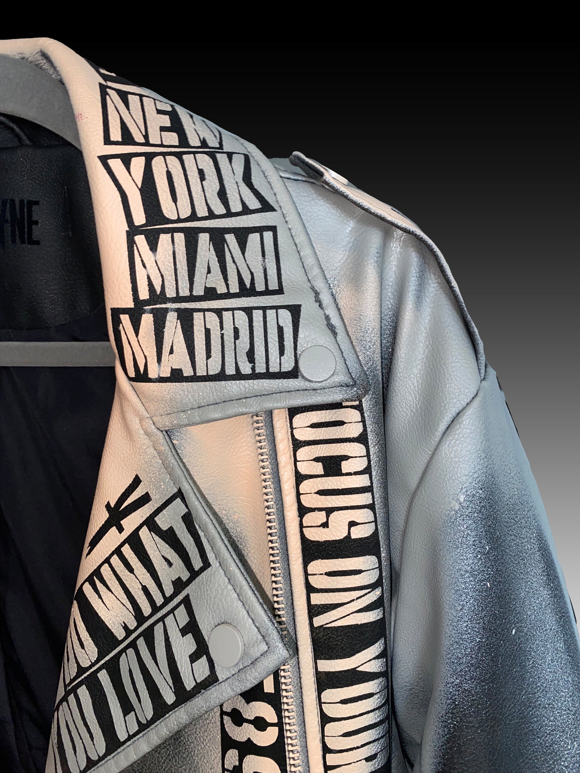 Diese oversized und kurz geschnittene Lederjacke ist dank des handgefertigten Designs ein richtiger Hingucker. Die Vorderseite der Jacke ist mit einem auffälligen Statement Design versehen, wobei die Rückseite der Jacke eher schlicht geblieben ist. Der grüne Farbverlauf ist perfekt für den Frühling.