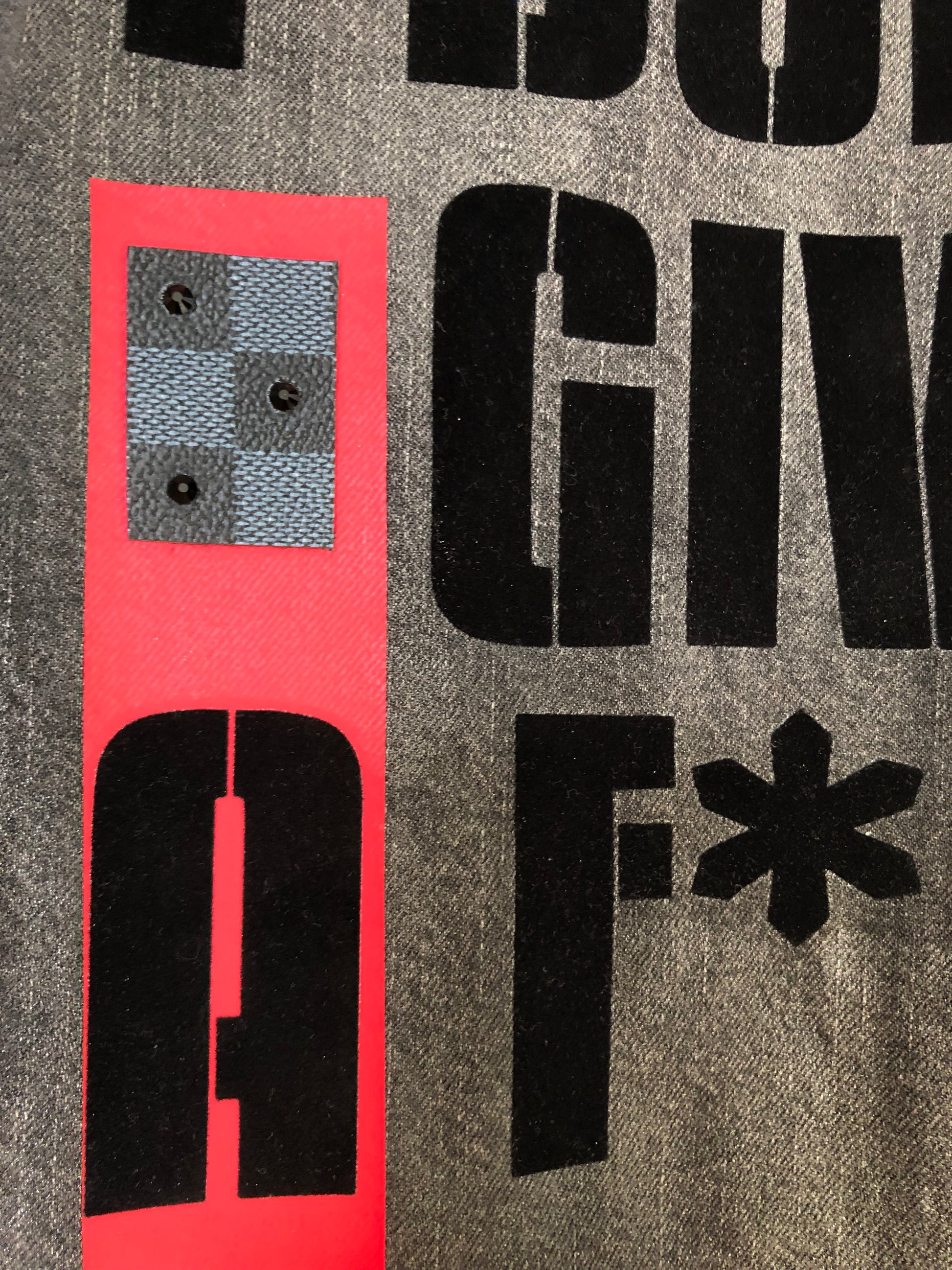 Die graue Jeans Jacke ist mit einem coolen Design und verschiedenen Akzenten versehen. Neben Schriftzügen zieren auch Farbakzente und Lederpatches die Jacke. Das Design wurde per Hand gefertigt und es handelt sich um ein reines Unikat.