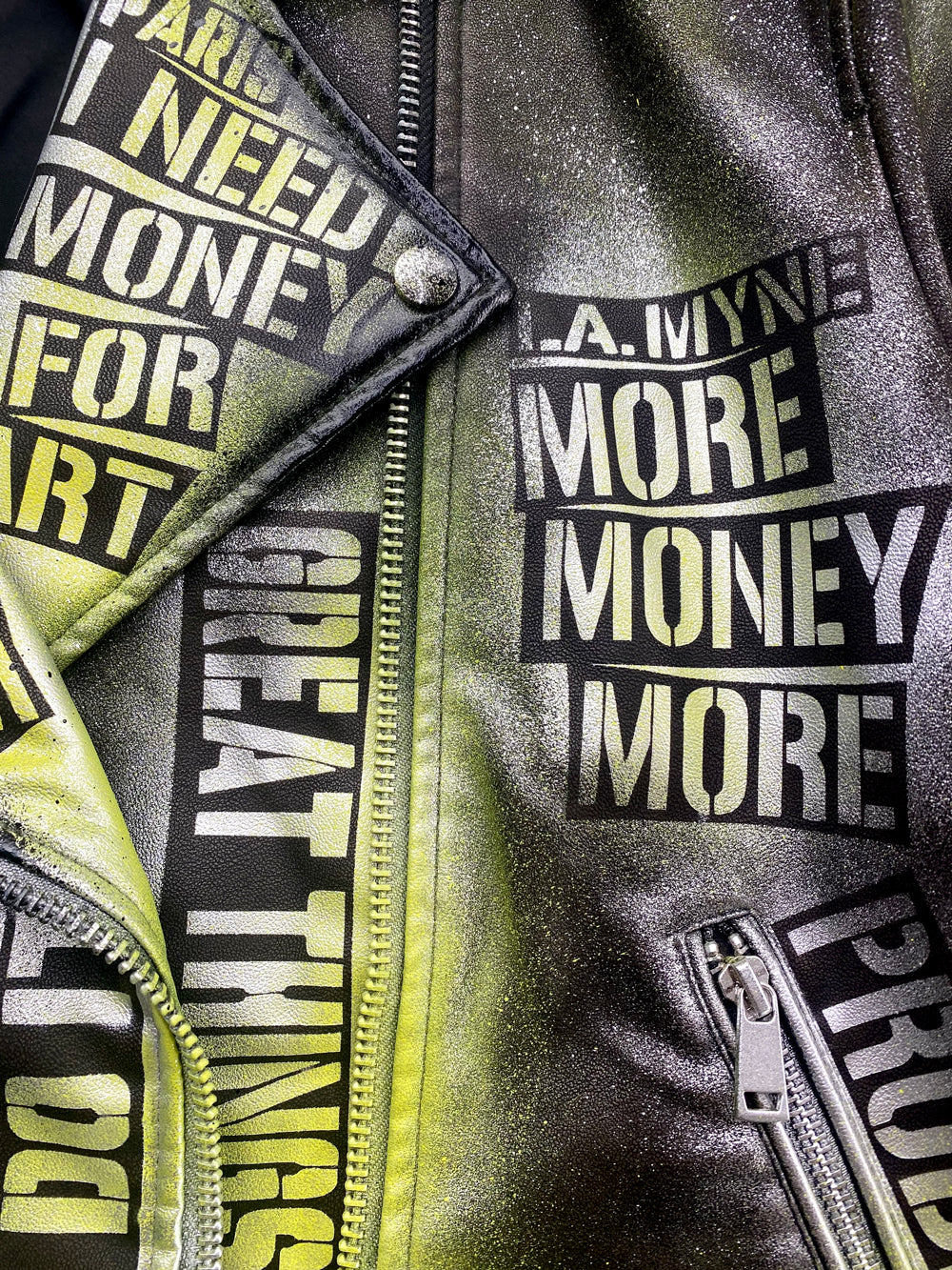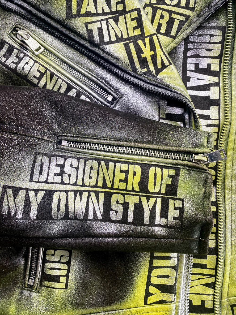 Diese oversized geschnittene Lederjacke (Kunstleder) ist dank des handgefertigten Designs ein richtiger Hingucker. Die Vorderseite der Jacke ist mit einem auffälligen Statement Design versehen, wobei die Rückseite der Jacke schlicht geblieben ist.