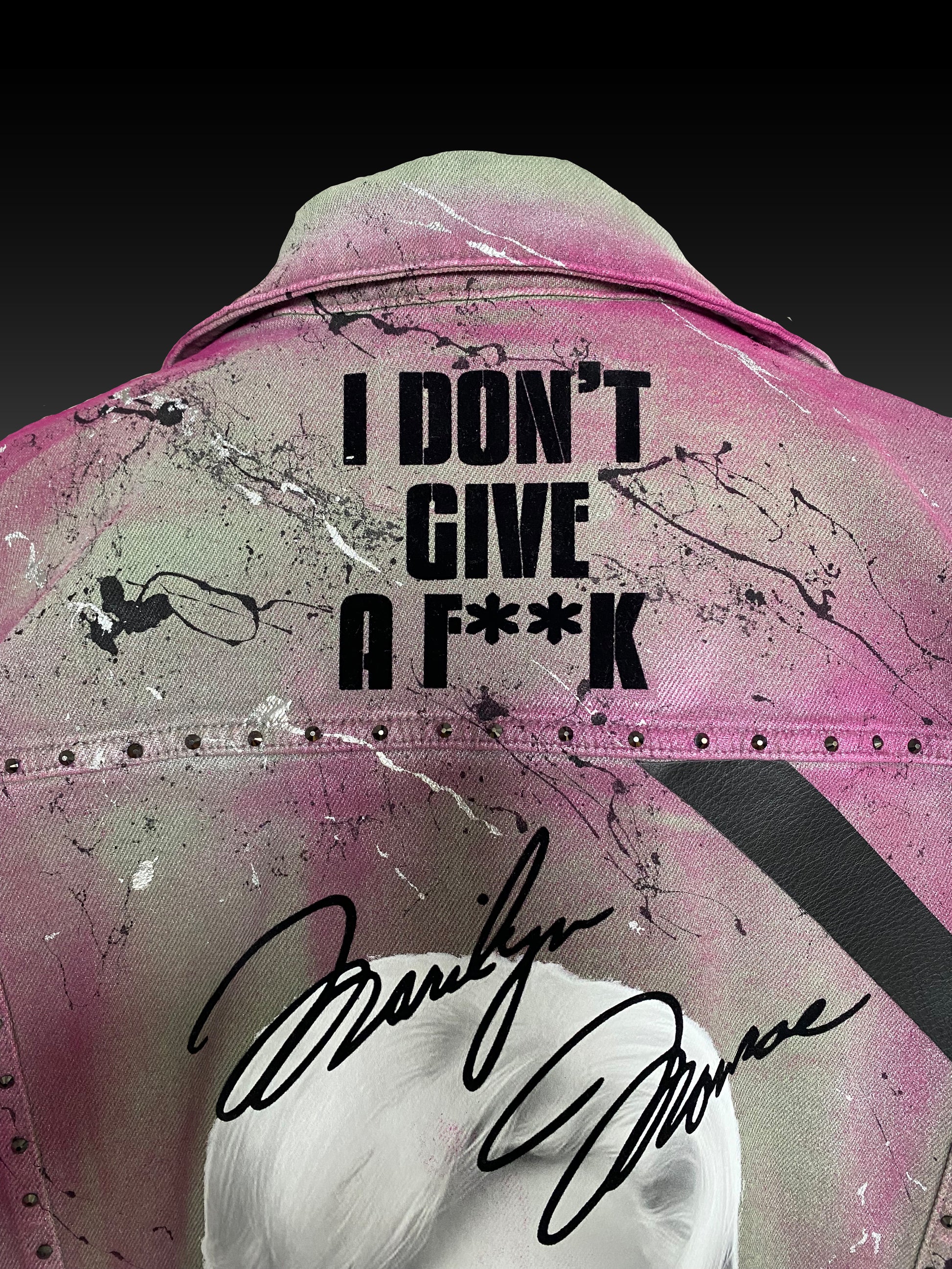 Diese graue Jeansjacke wurde mit einem handgefertigten Design aus verschiedensten Techniken versehen. Neben dem dusty pinken Farbverlauf und den Schriftzügen, verziert auch ein Marilyn Monroe Print und Strasssteine das Kleidungsstück.