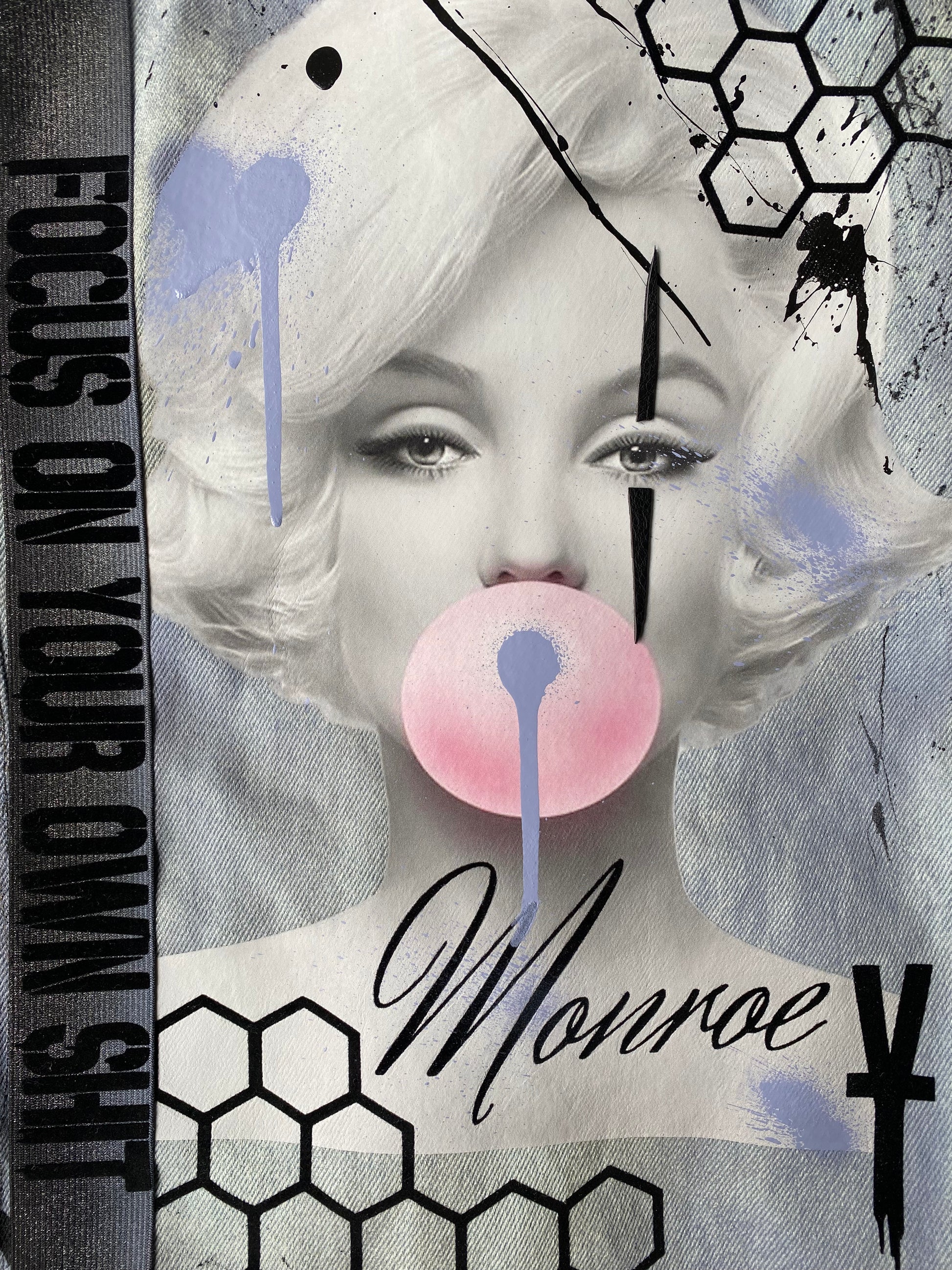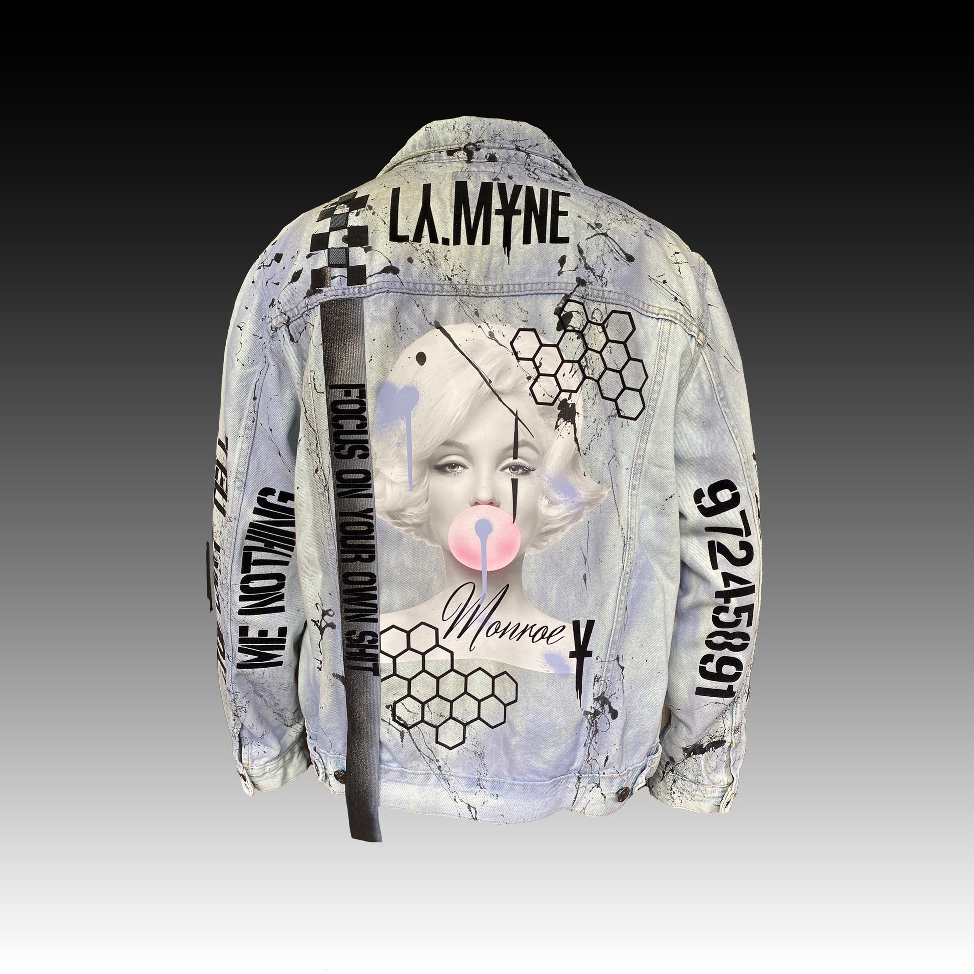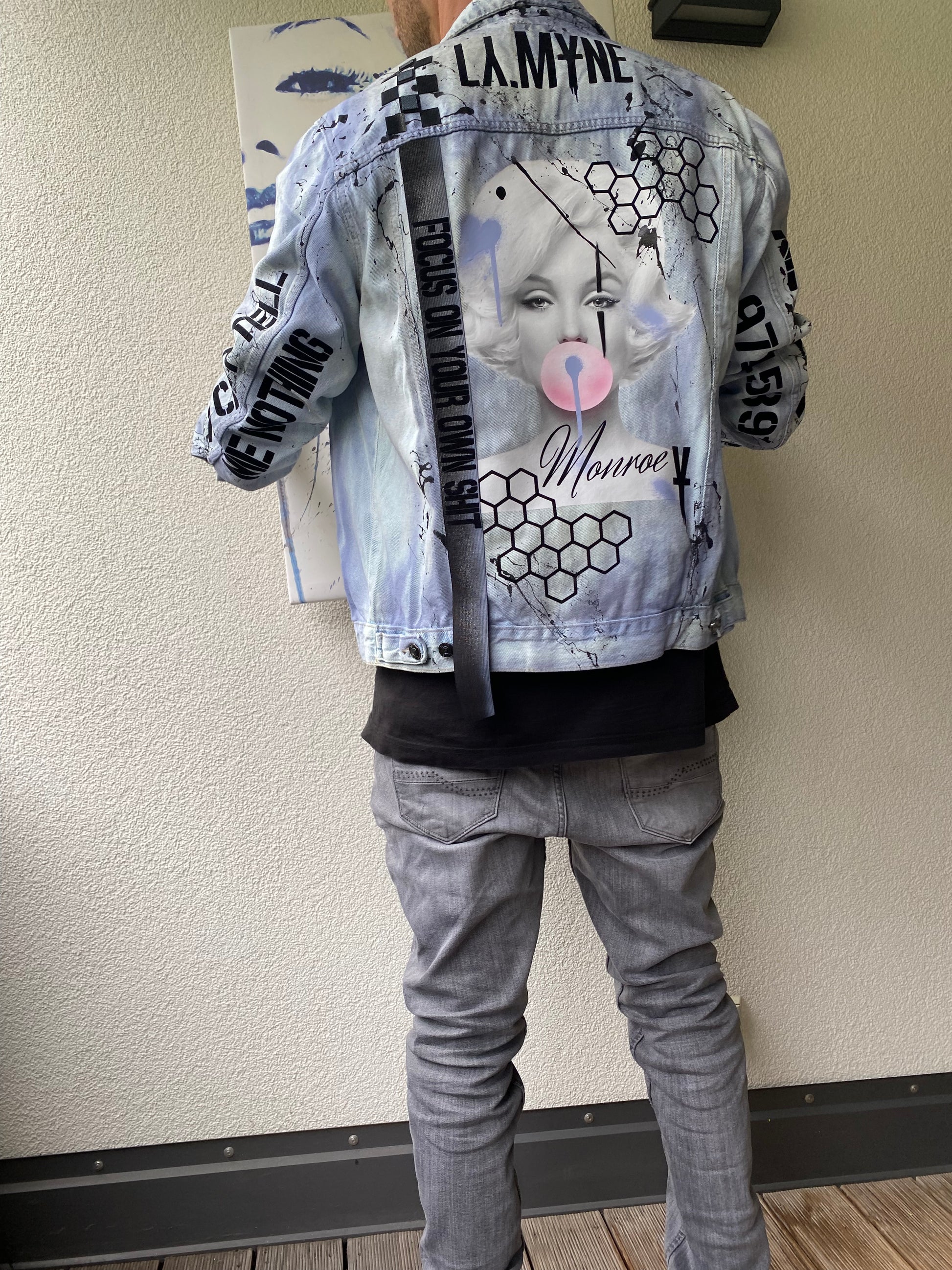 Diese hellblaue Jeansjacke wurde mit einem handgefertigten Design aus verschiedensten Techniken versehen. Neben dem dusty lila Farbverlauf und den Schriftzügen, verziert auch ein Marilyn Monroe Print und Leder Patches das Kleidungsstück.
