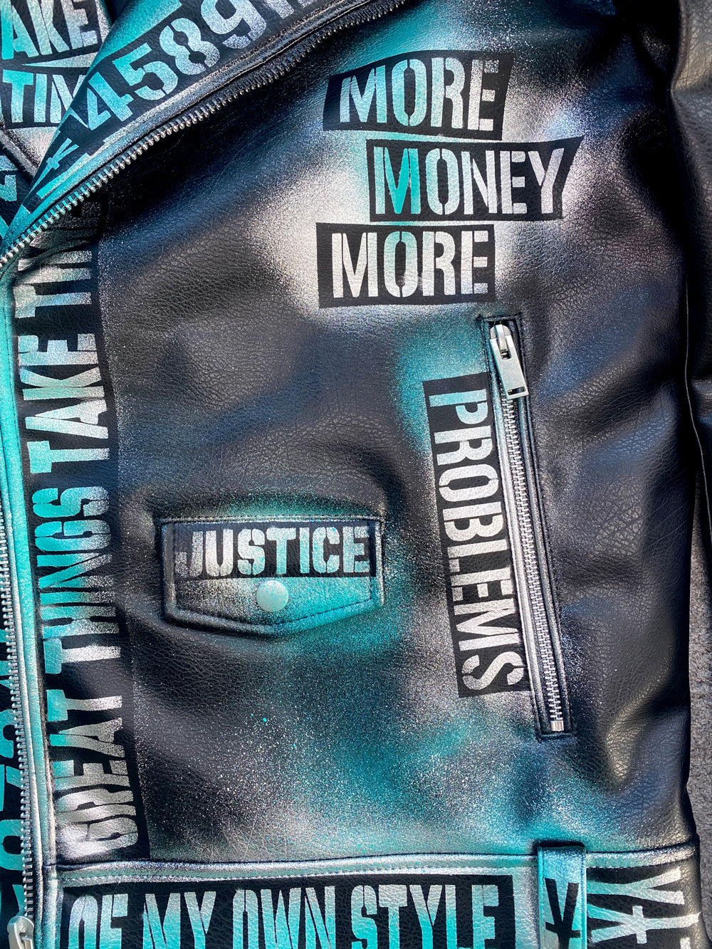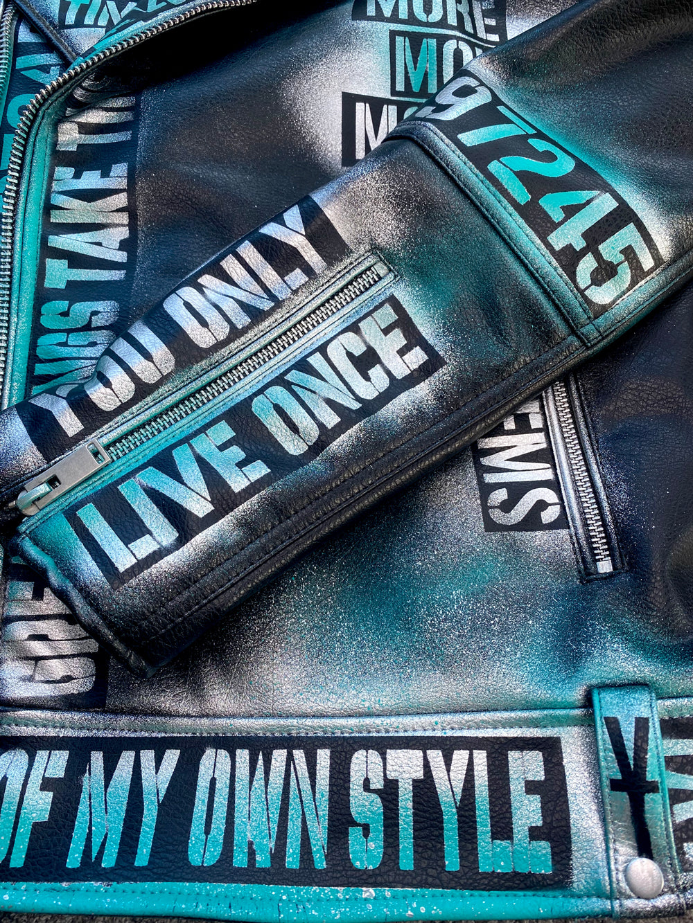 Diese gut geschnittene Lederjacke (Kunstleder) ist dank des handgefertigten Designs ein richtiger Hingucker. Die Vorderseite der Jacke ist mit einem auffälligen Statement Design versehen, wobei die Rückseite der Jacke schlicht geblieben ist.