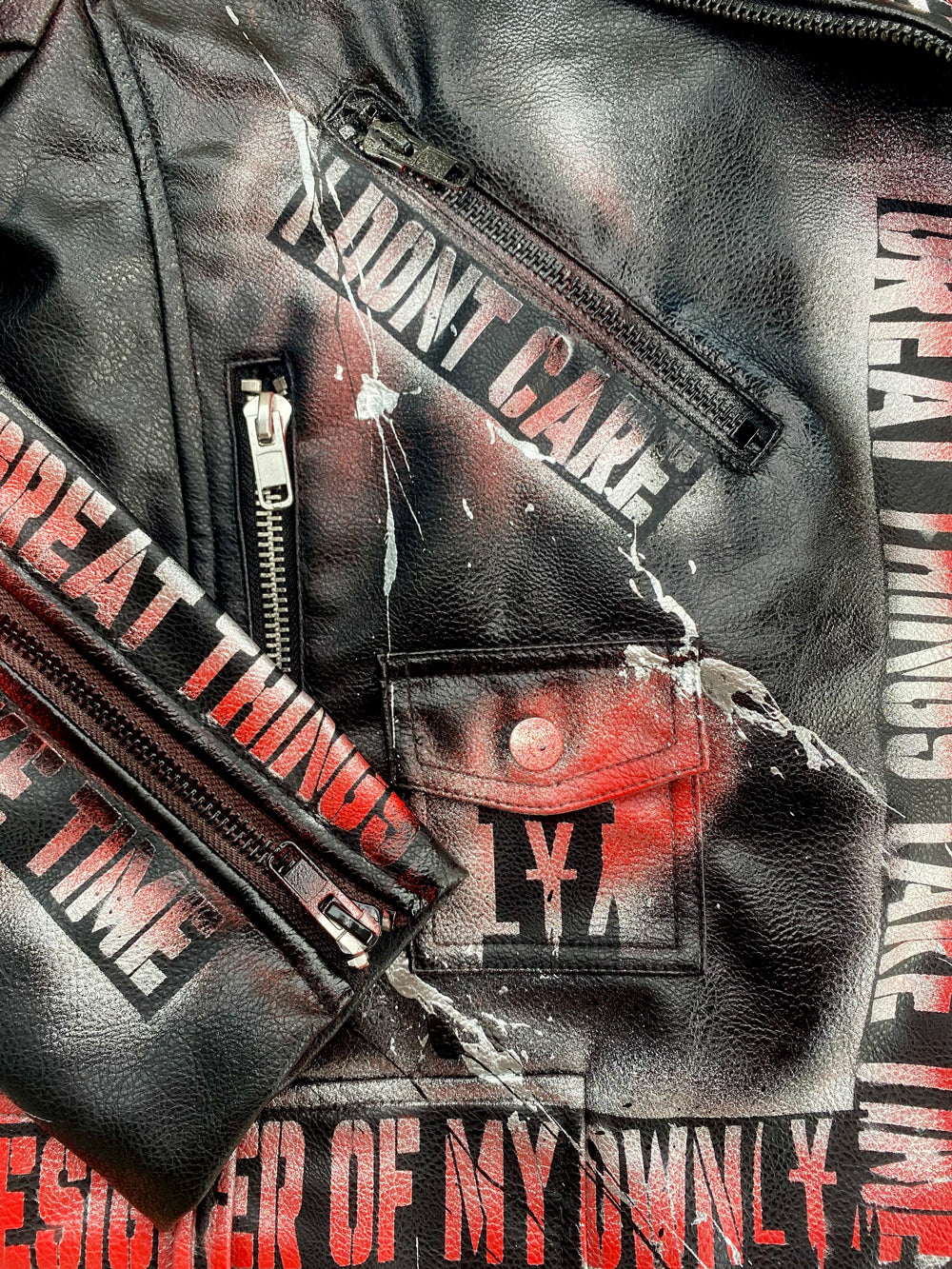 Diese oversized geschnittene Lederjacke ist dank des handgefertigten Designs ein richtiger Hingucker. Die Vorderseite der Jacke ist mit einem auffälligen Statement Design versehen, wobei die Rückseite der Jacke schlicht geblieben ist.