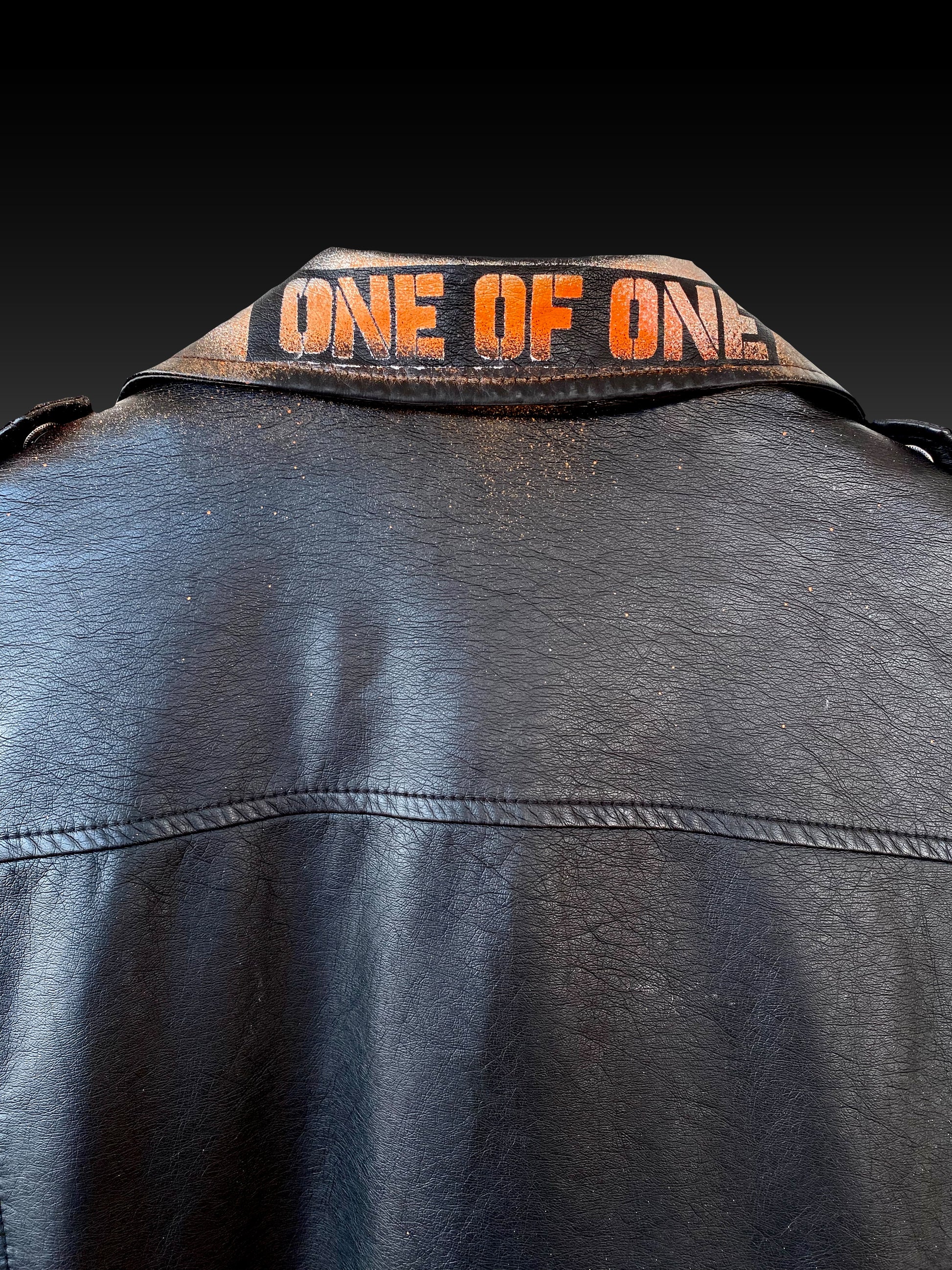 Diese gut geschnittene Lederjacke (Kunstleder) sitzt ausgesprochen gut und ist dank des handgefertigten Designs ein richtiger Hingucker. Die Vorderseite der Jacke ist mit einem auffälligen Statement Design versehen, wobei die Rückseite der Jacke schlicht geblieben ist.