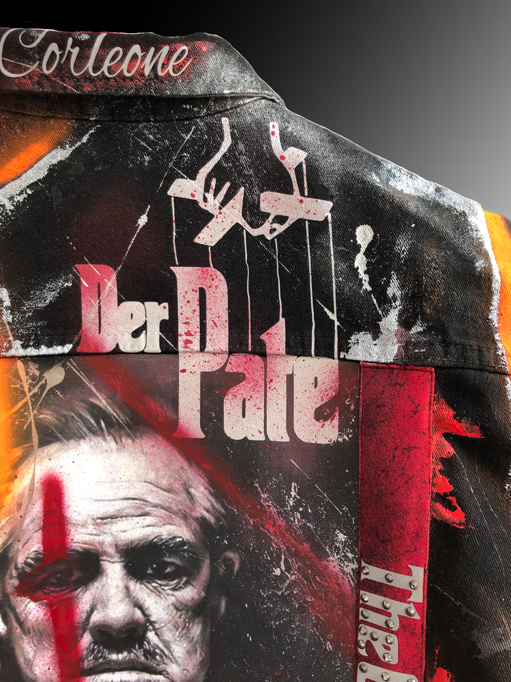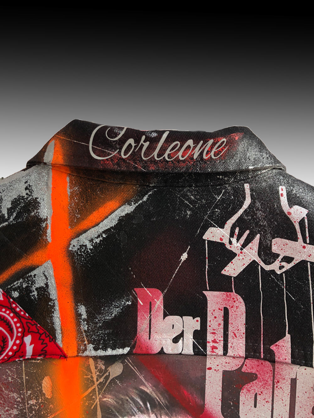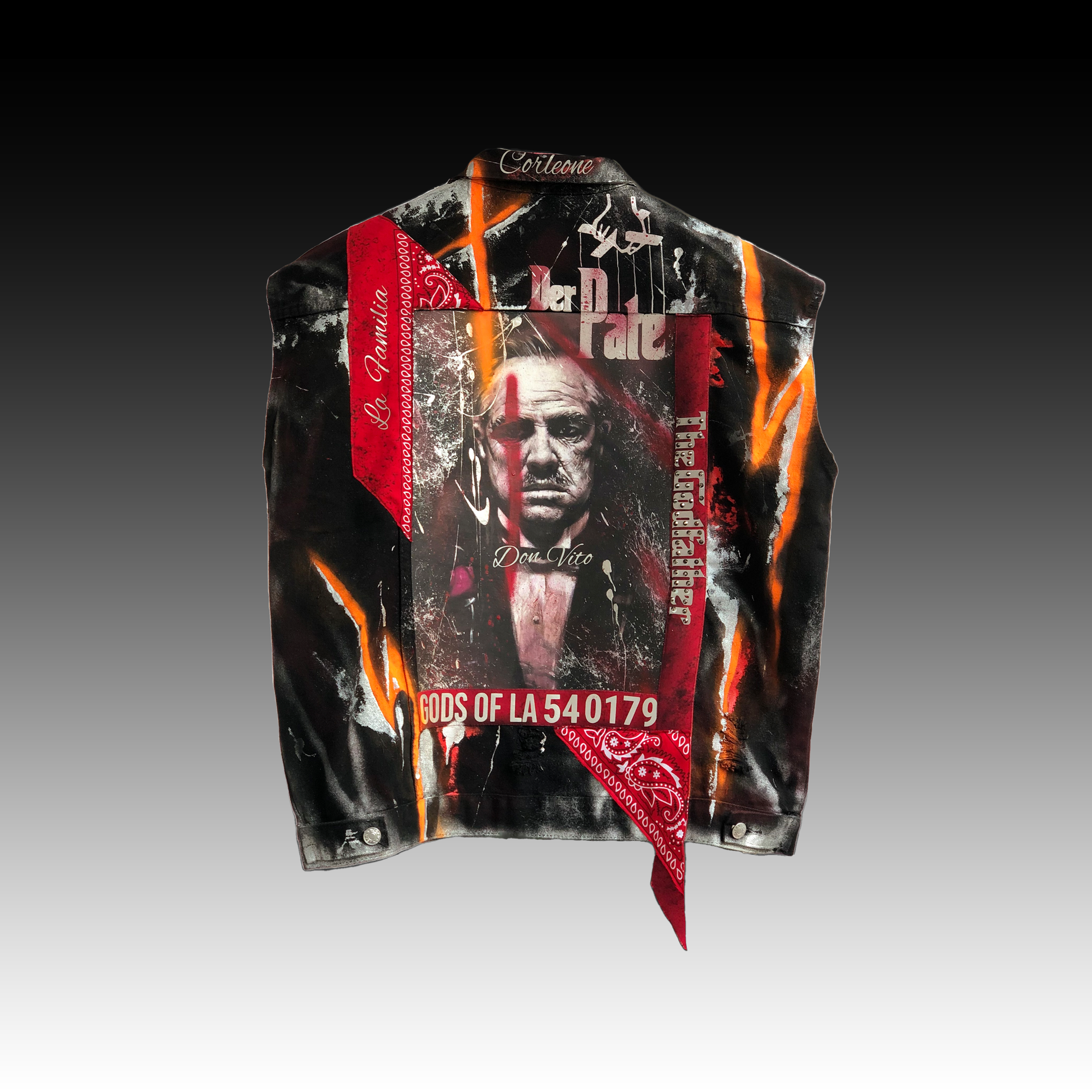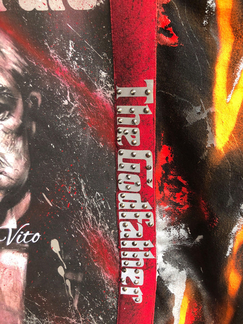 Die schwarze Jeans Weste mit "Godfather" Design überzeugt mit knalligen Farben, Swarovski Strass Steinen und Bandana Akzenten.