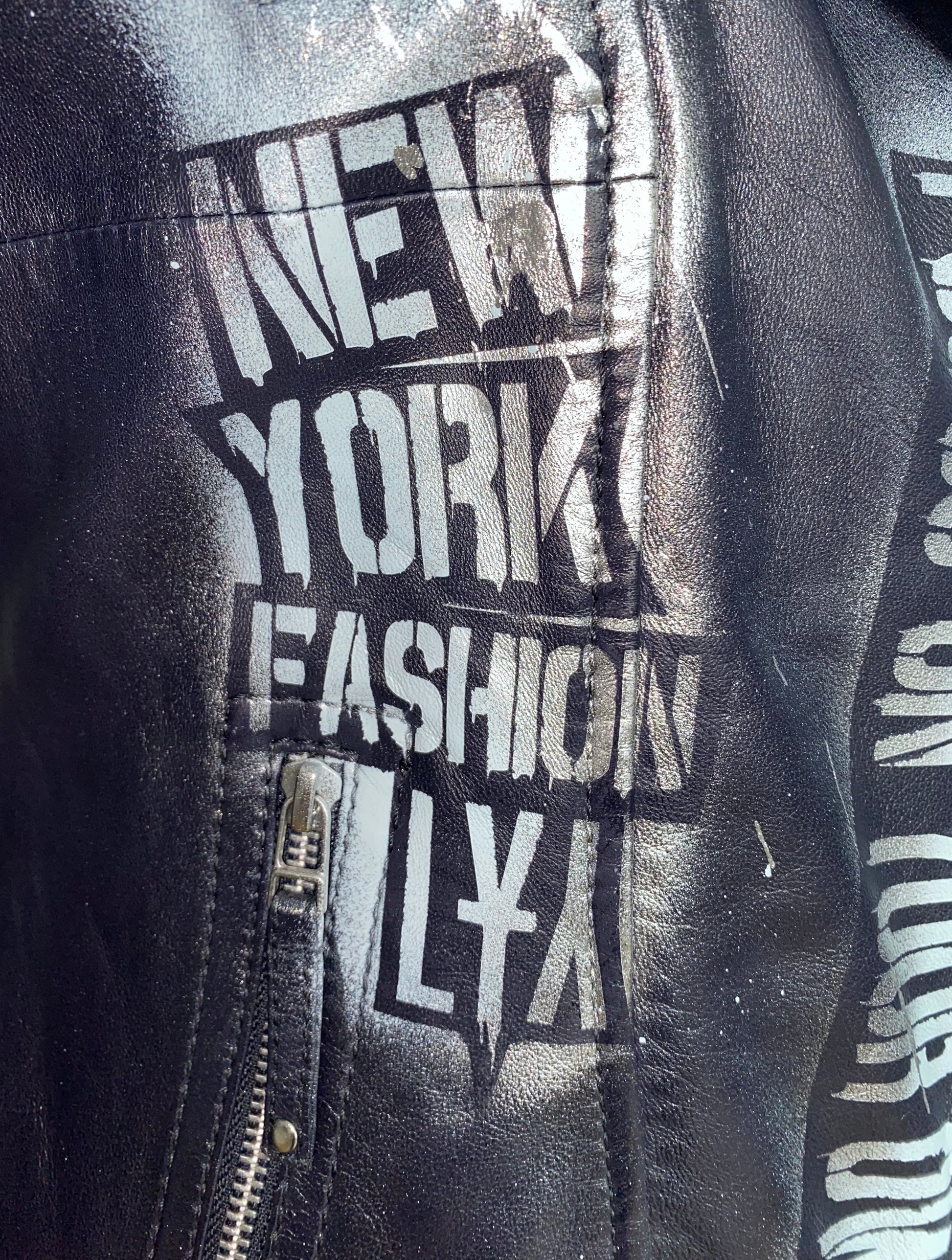 Diese schmal geschnittene Lederjacke ist dank des handgefertigten Designs ein richtiger Hingucker. Die Vorderseite der Jacke ist mit einem coolen Statement Design versehen, wobei die Rückseite der Jacke eher schlicht geblieben ist. Ein hellblauer Farbverlauf rundet das Design ab.